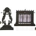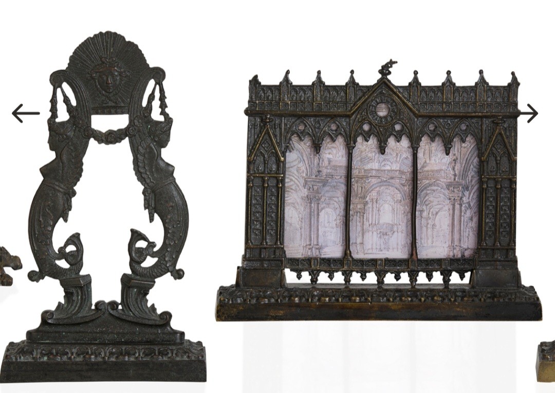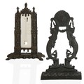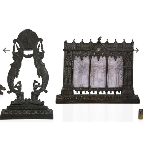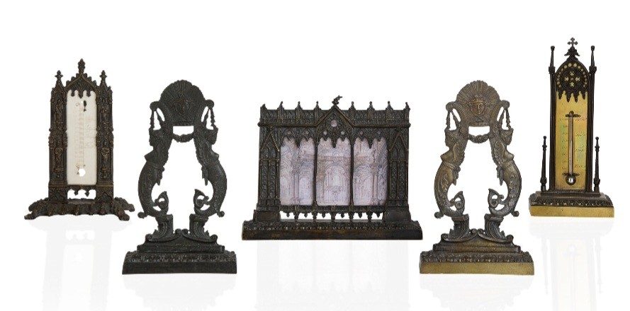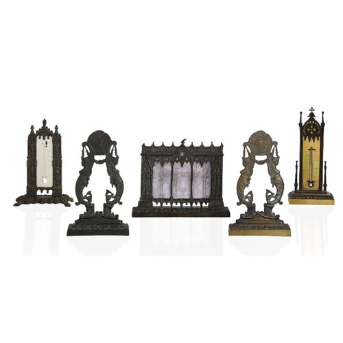 One in the form of a Gothic arched window with quatrefoil tracery and cruciform finial, containg a thermometer and brass gauge plate. Another with a Gothic lancet window flanked by niches containing saints, with a later silvered metal gauge plate, the tube lacking. The last in the form of a Gothic rood screen with three doubled arched windows, side niches and an acraded freize on a plinth base