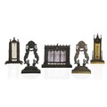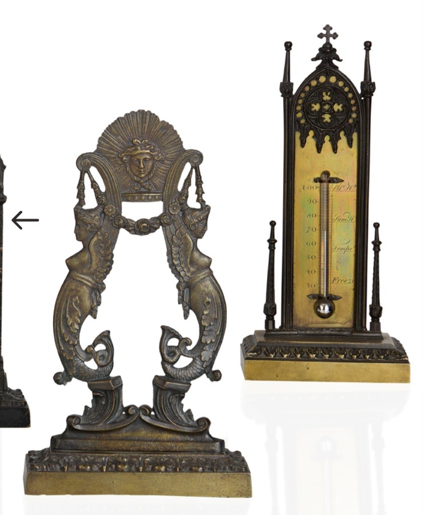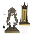 Collection of patinated metal thermometer stands to include a pair of T.C Salt, birmingham with Apollo masks supported by winged caryatids, on leaf cast rectangular plints impressed PUB By SALT APL18.1828.