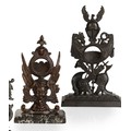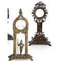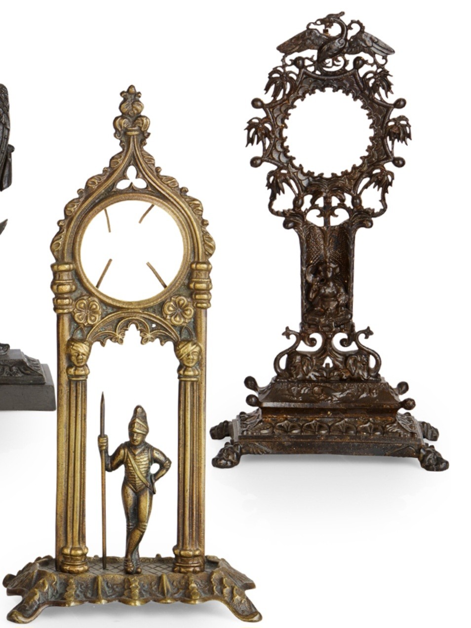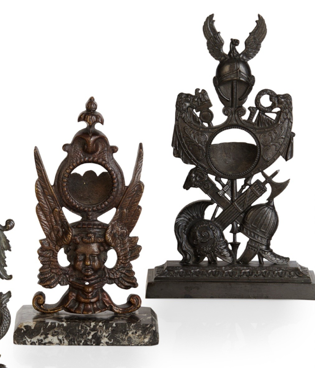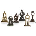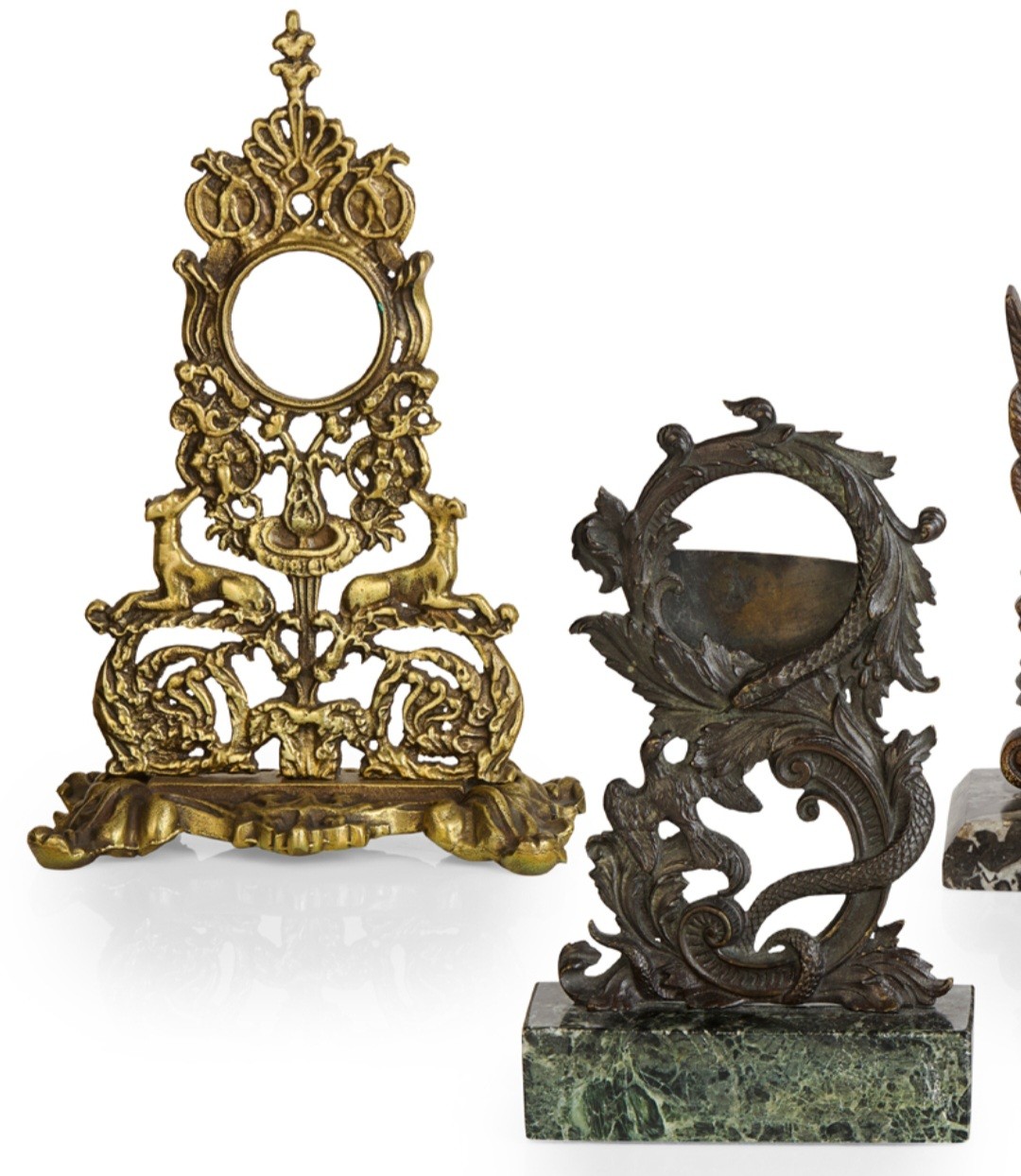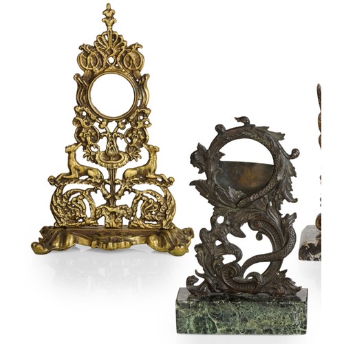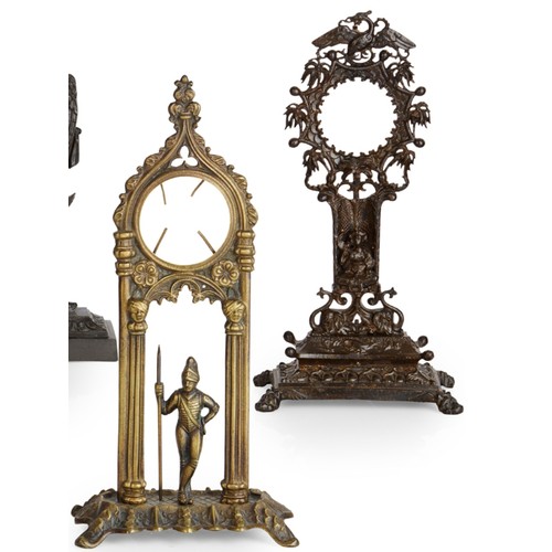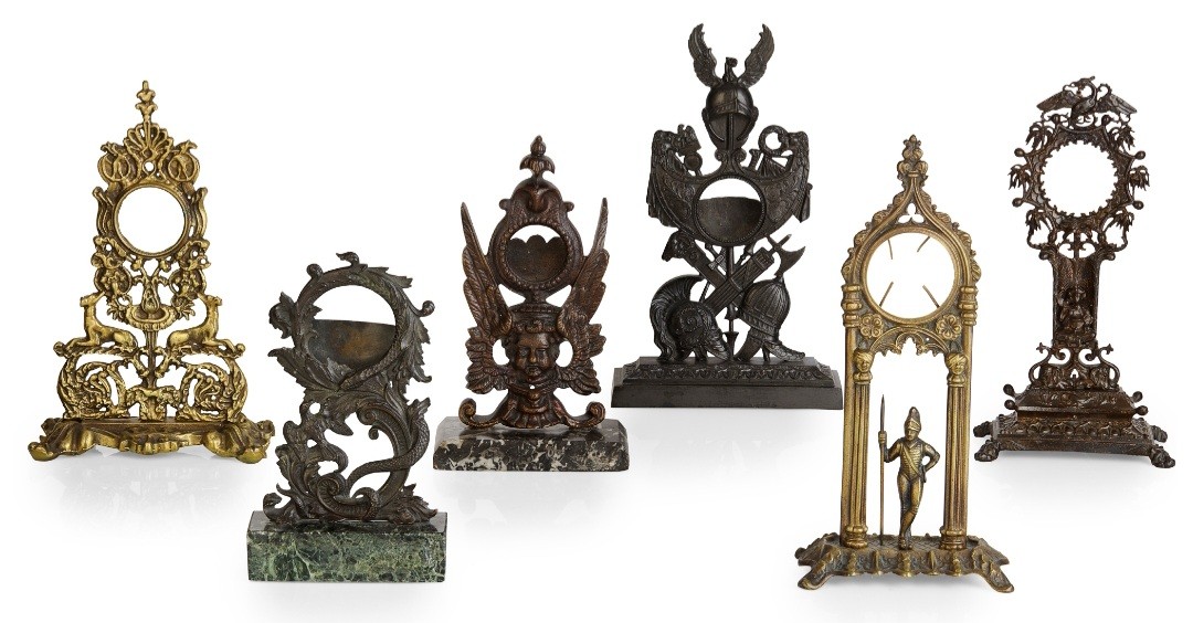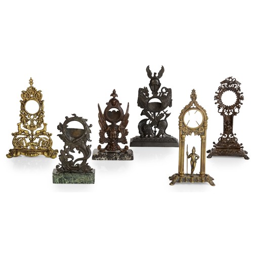 Six patinated metal or brass pocket watch stands the first cast in shallow relief with trophies of war and surmounted by a wing helmet. The second in the rococo style with C stroll, acanthus, a serpent and a bird on a girl base. The third in Chinese style with a seated buddha, elephants heads and surmounted by a ho-ho bird. The fourth cast with a winged putto mask surmounted by a foliate finial on a mable plinth. The fifth with a Gothic pointed arch and a standing figure of man in armour flanked by columns. The sixth pierced example cast with greyhounds and foliate scrolls with an anthemion cresting