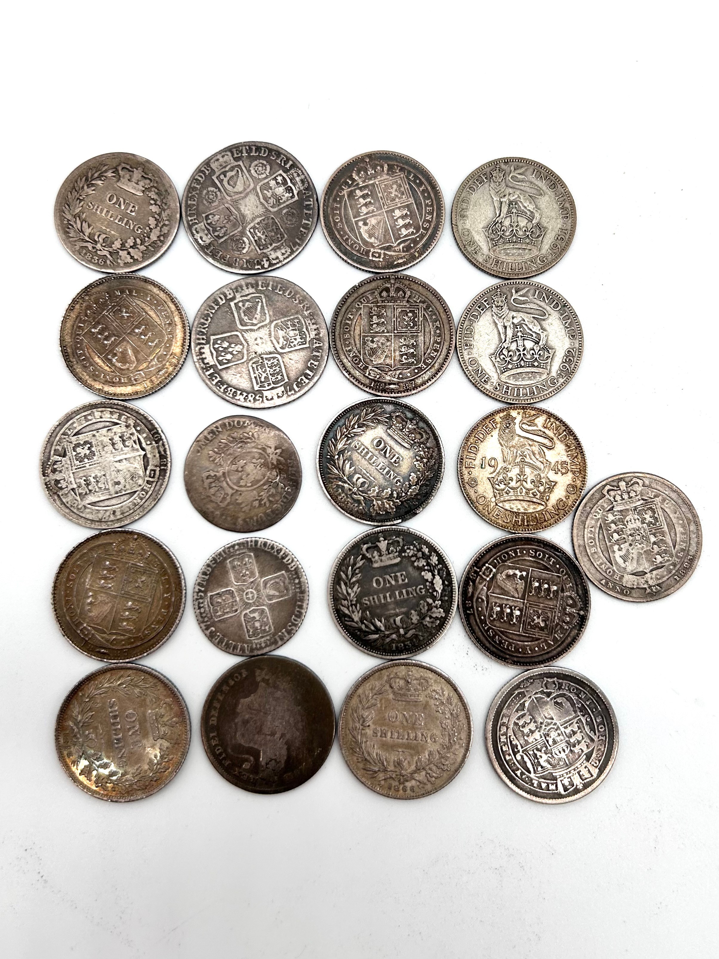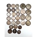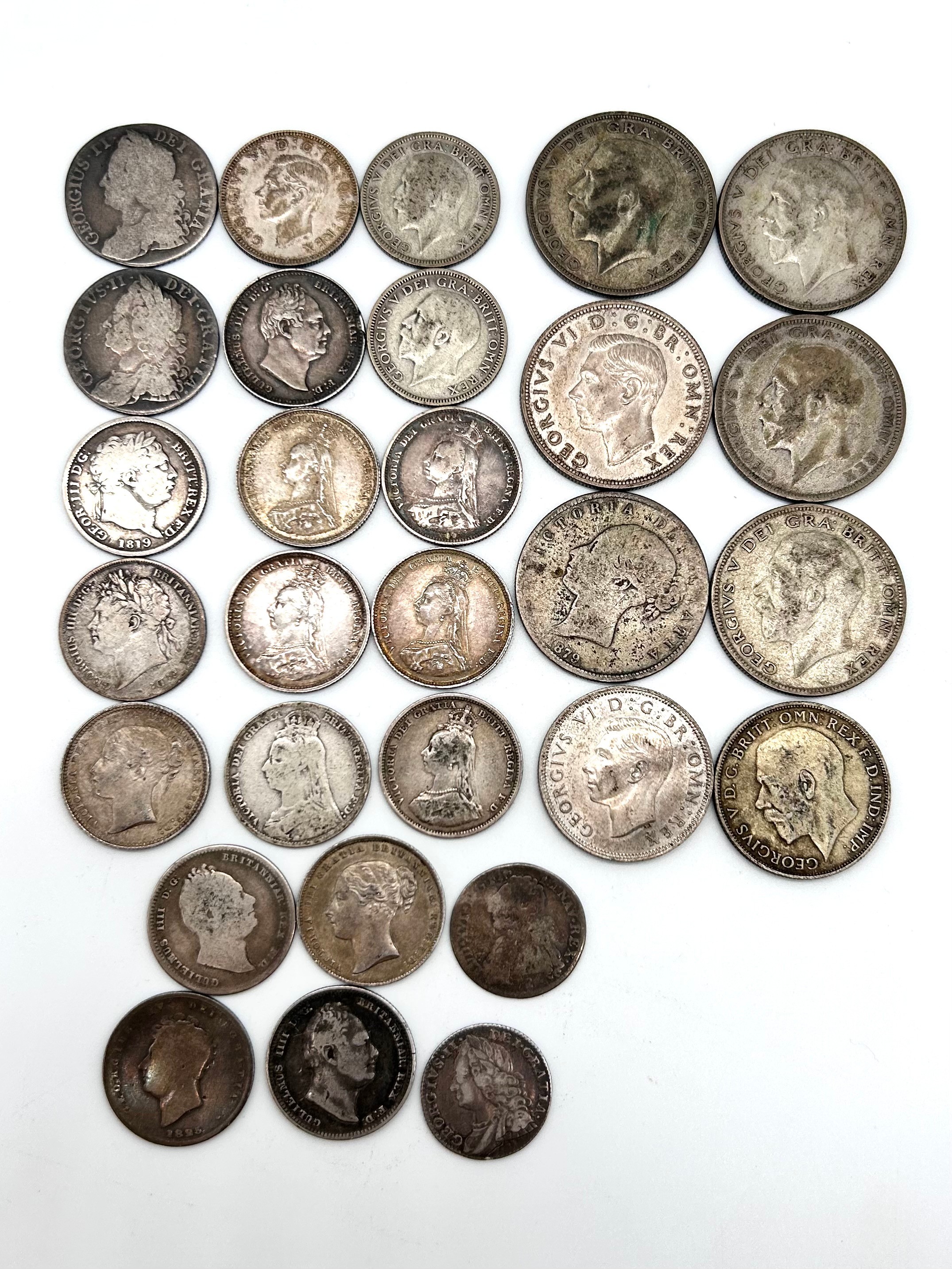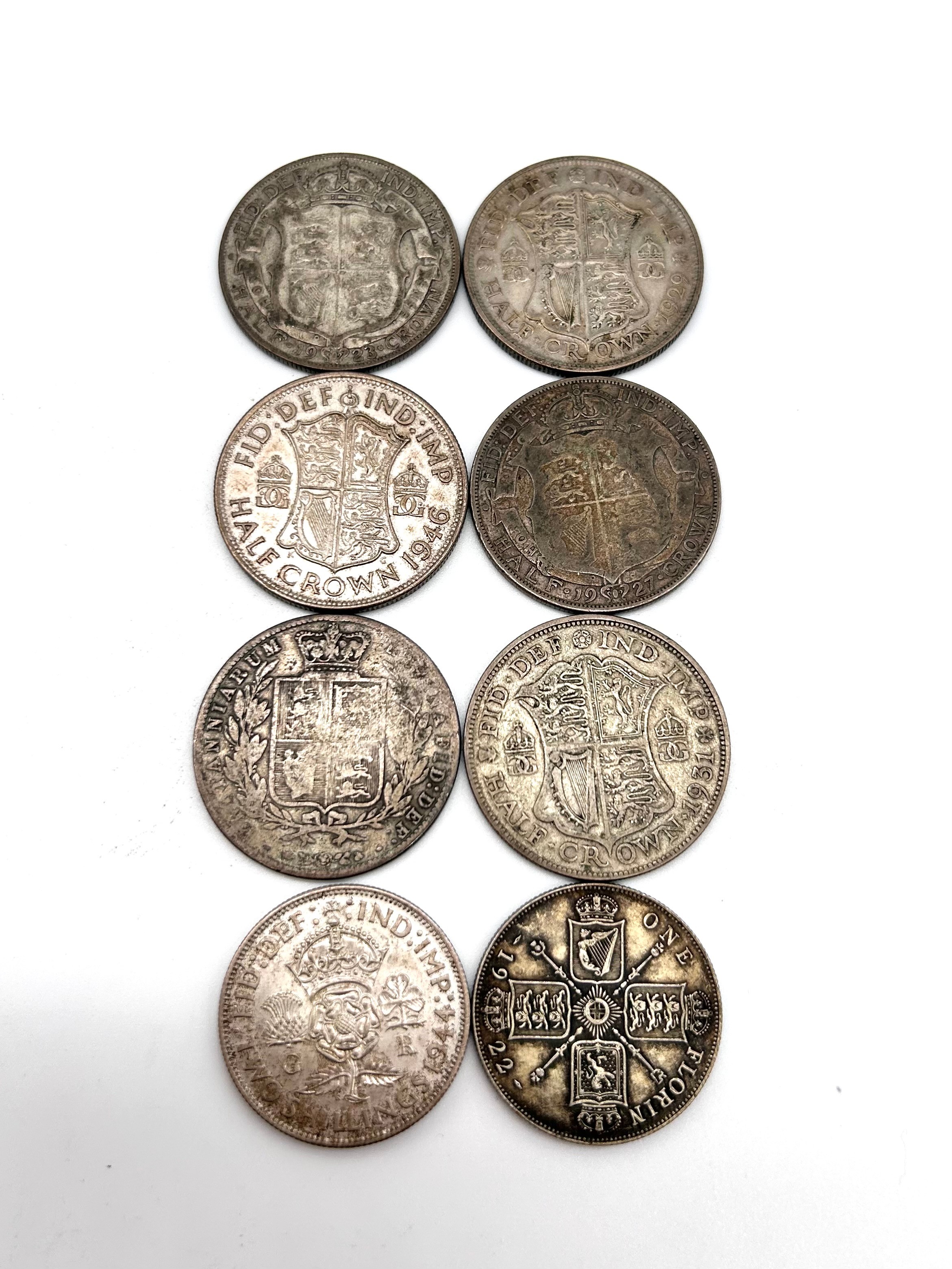Half crowns, various condition, see images; 1879, 1927, 1946, 1923, 1929, 1931, florins, 1944, 1922, shillings; Dates for F or better - 1887, 1757, 1834, 1887, 1866, 1868 YH VF, 1743, 1937, 1819, 1945, 1834 and others less than F [214g]