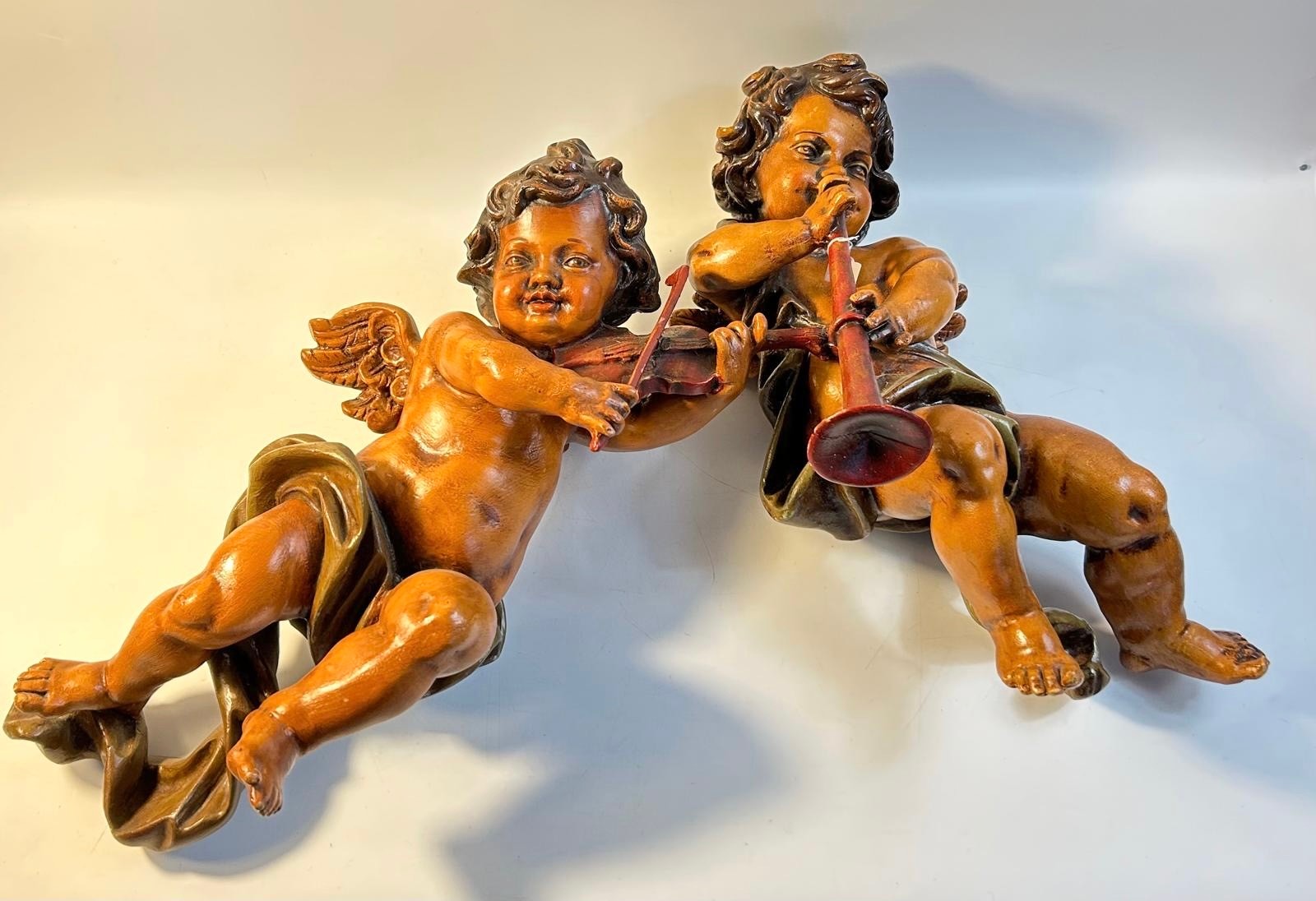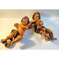 A pair of painted carved wood putto