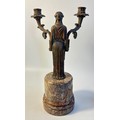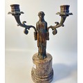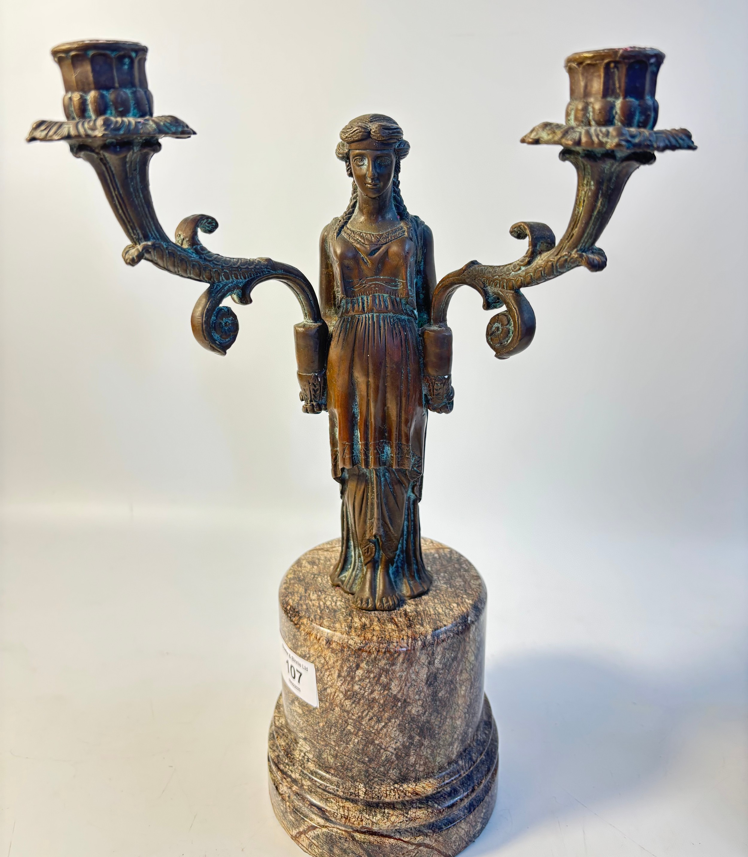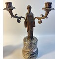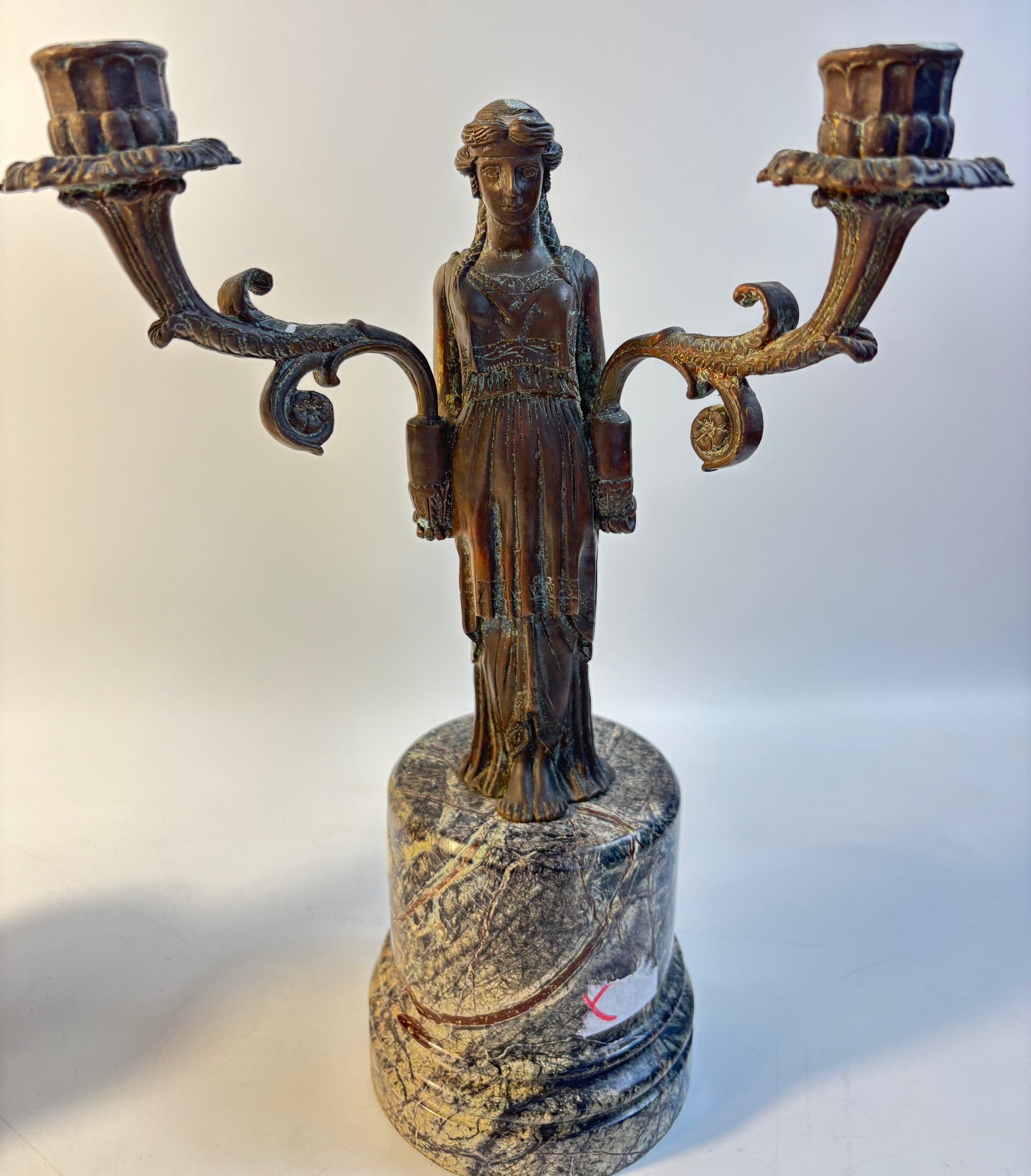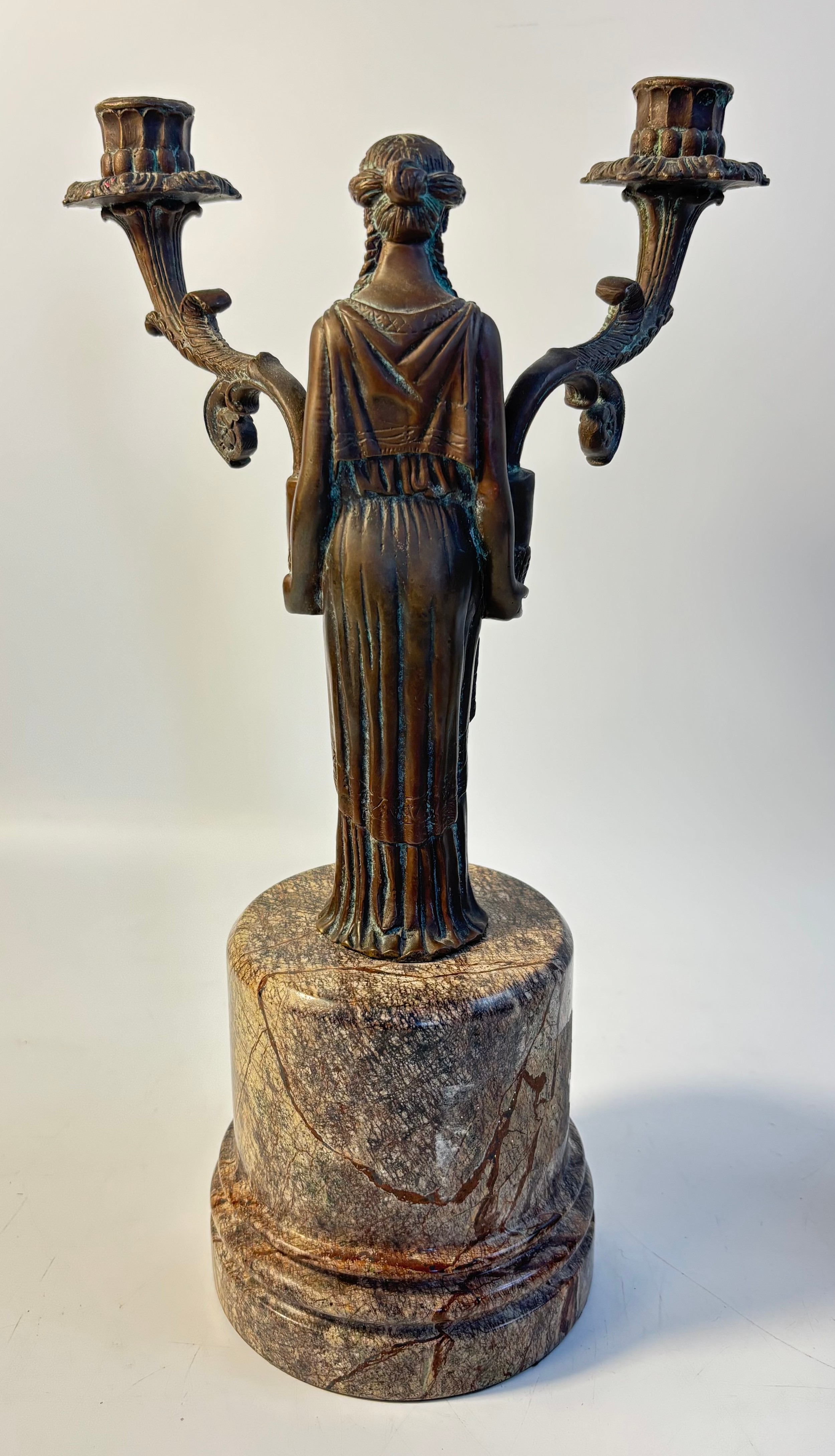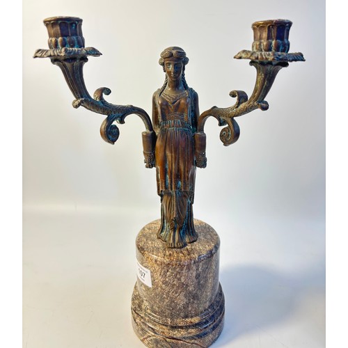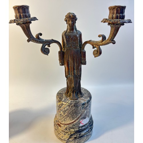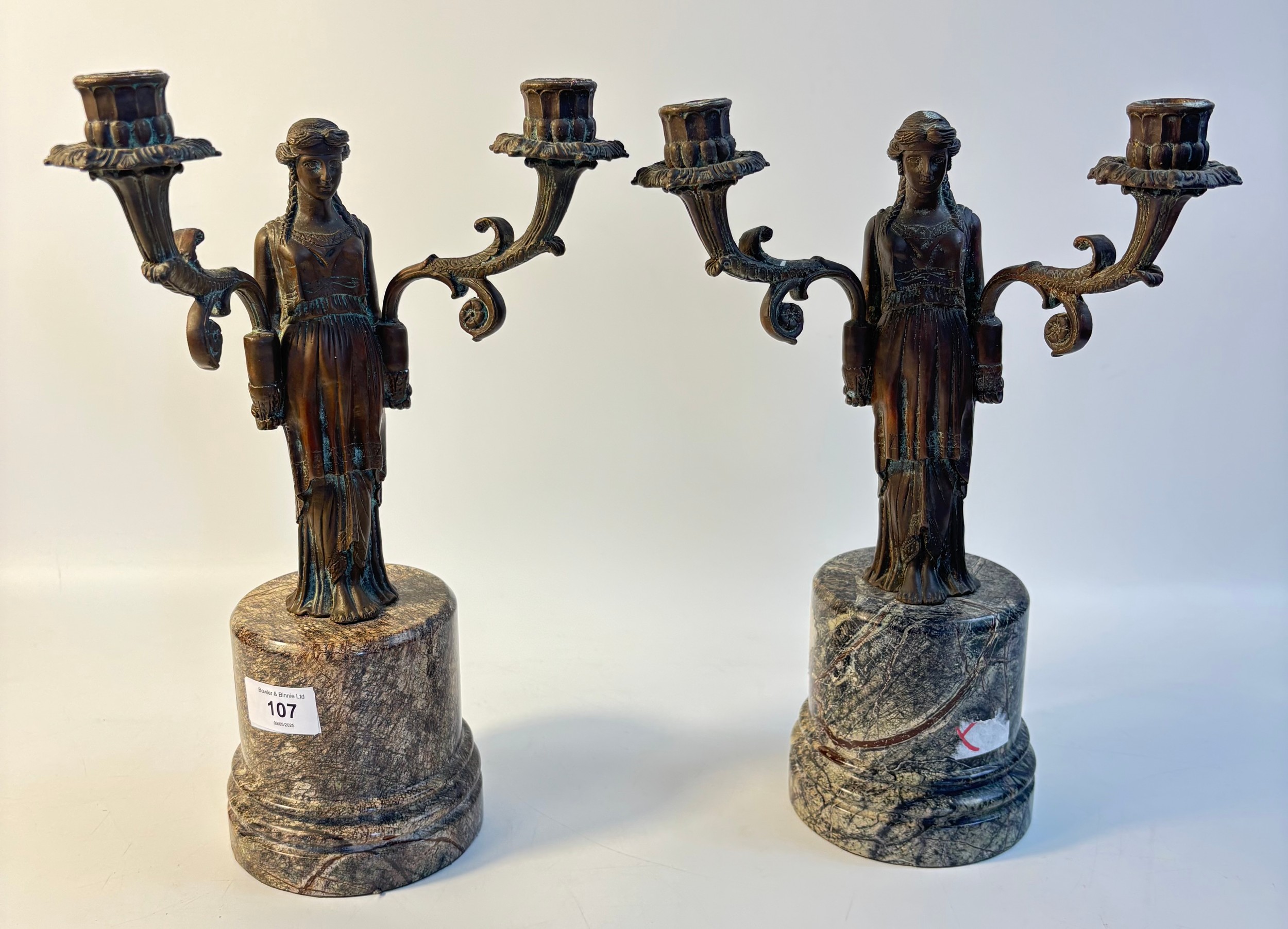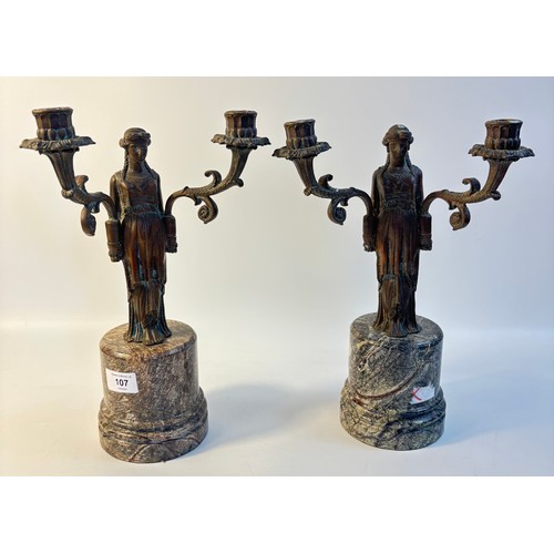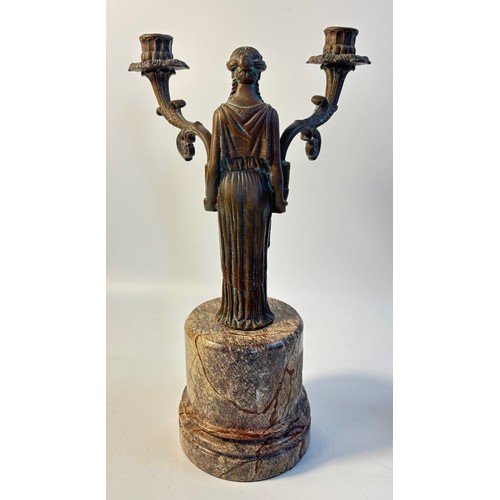 A pair of French bronzed two light figural table candelabra, the Greek style maiden figures holding the branches all on grey round marble pedestals