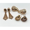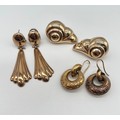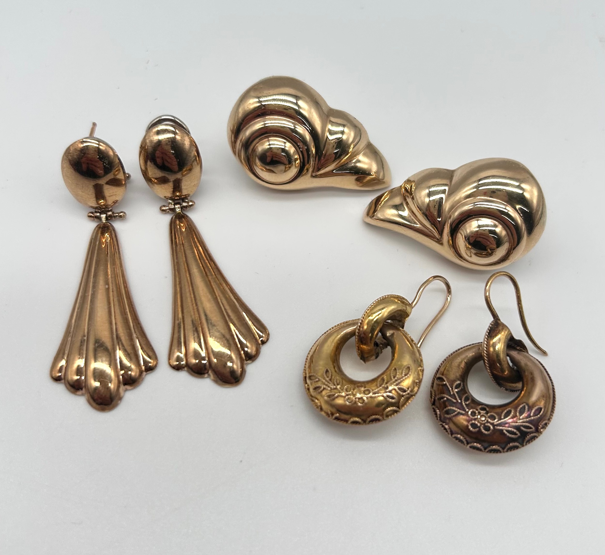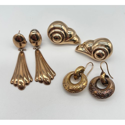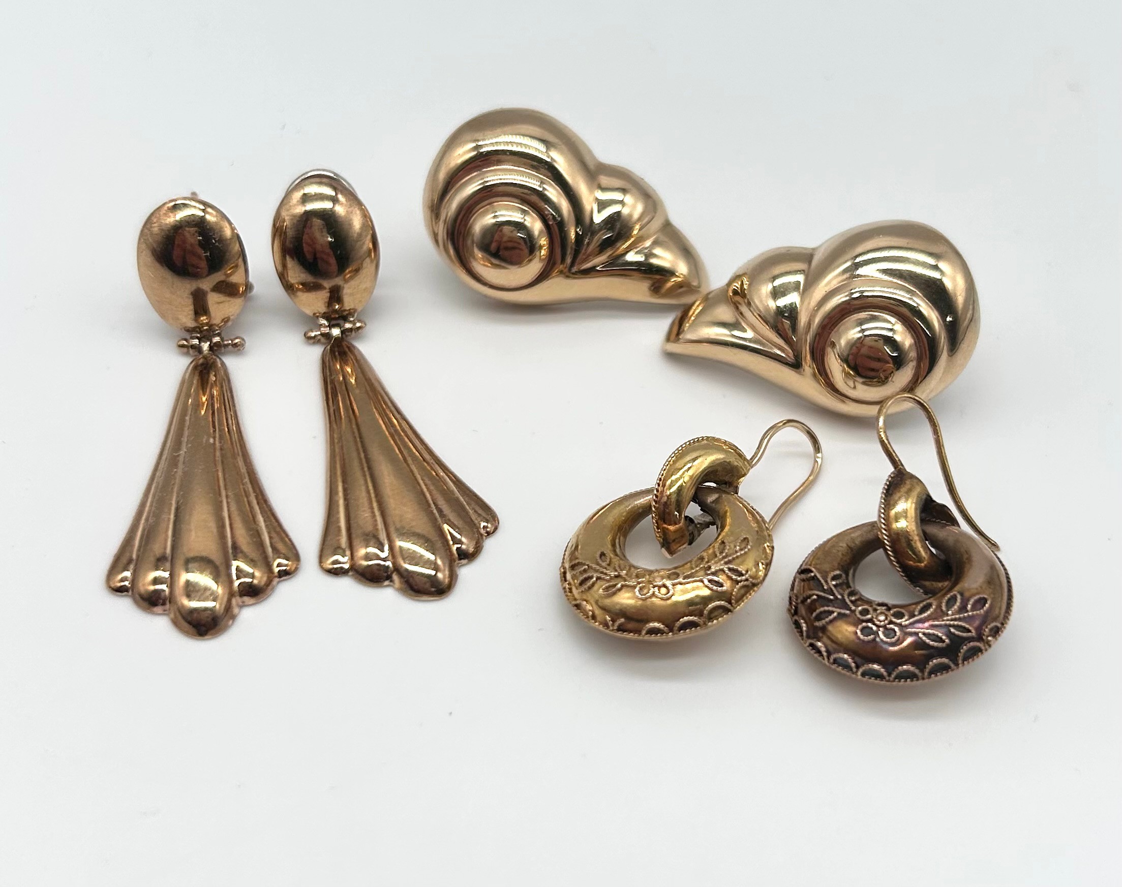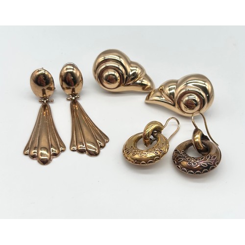 Two pairs of 9ct gold earrings of bold shell design and A pair of Victorian earrings of crescent shape with wire work decoration