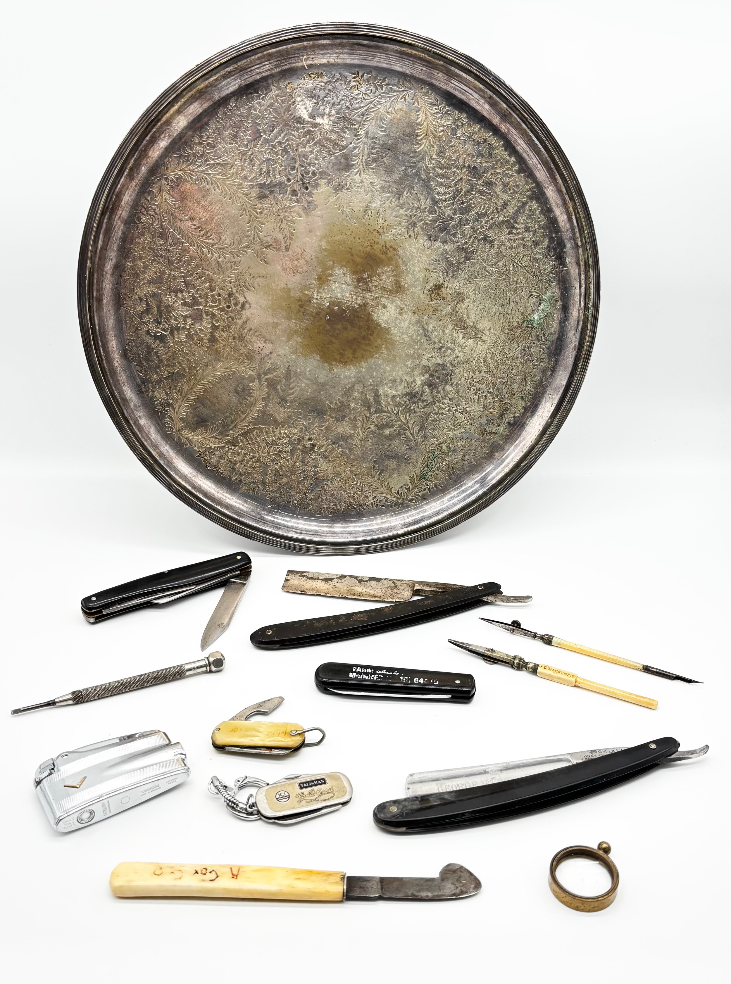 Silver plated circular tray, collection of pocket knives and vintage razors and a Ronson lighter