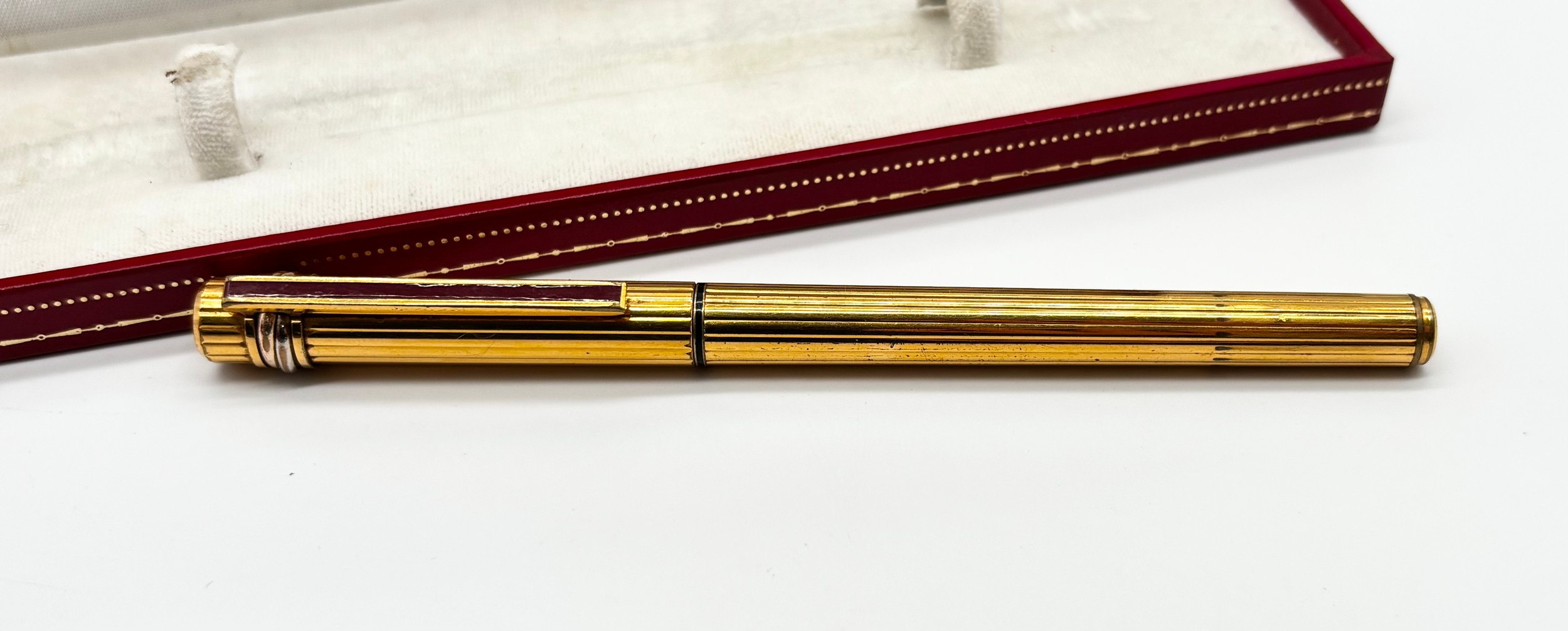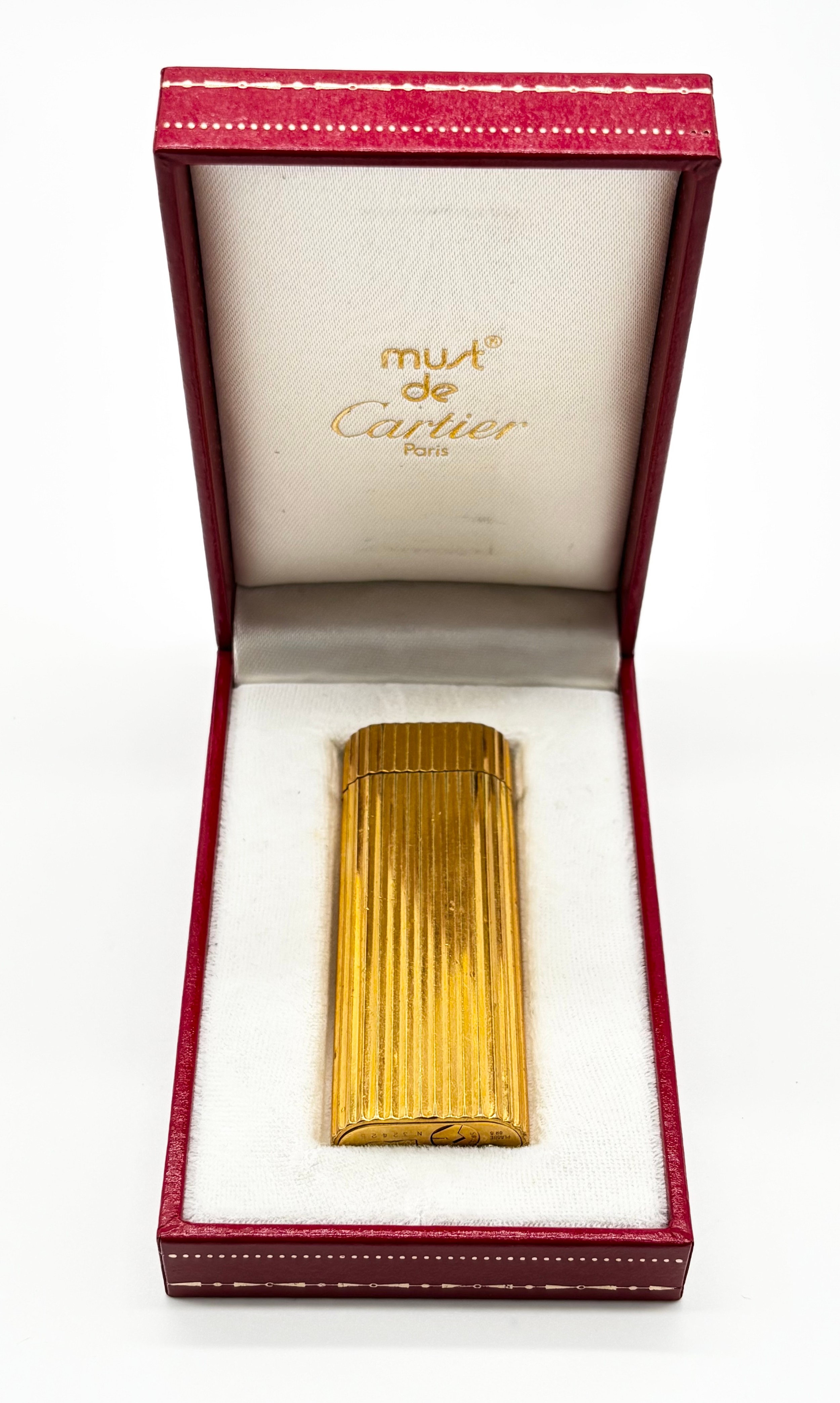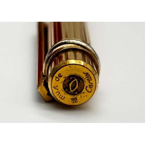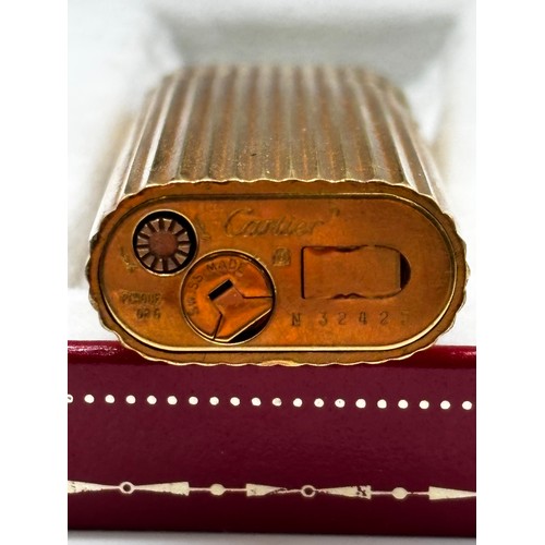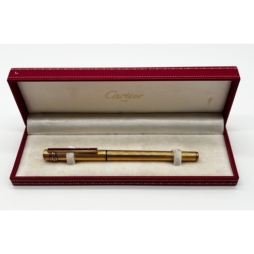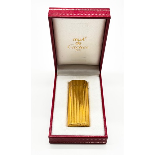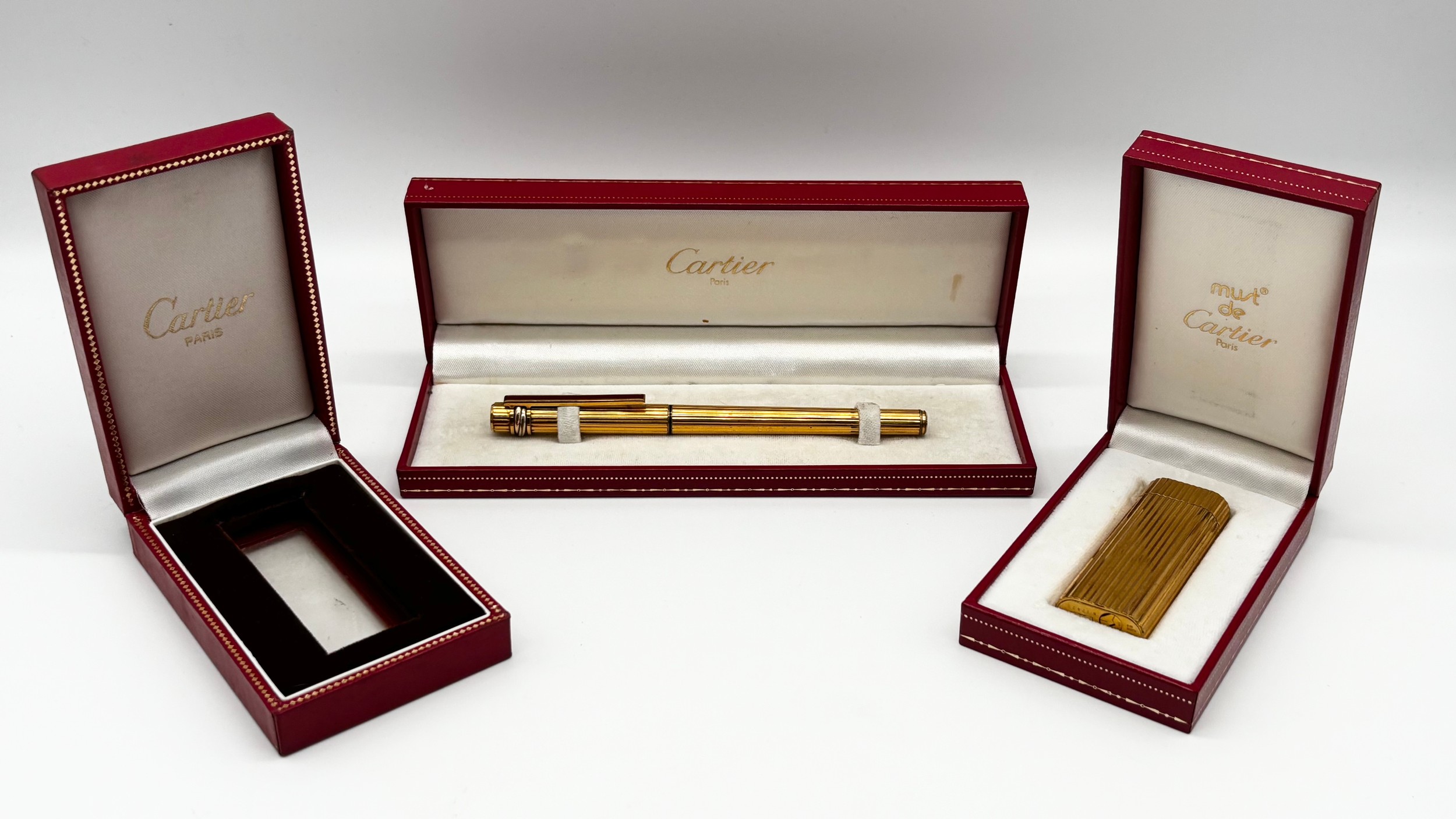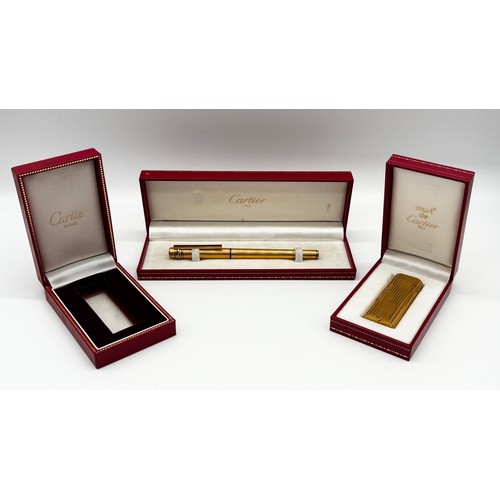 Gold plated Must De Cartier lighter in original box, Cartier gold plated ballpoint pen in original box and a Cartier lighter box