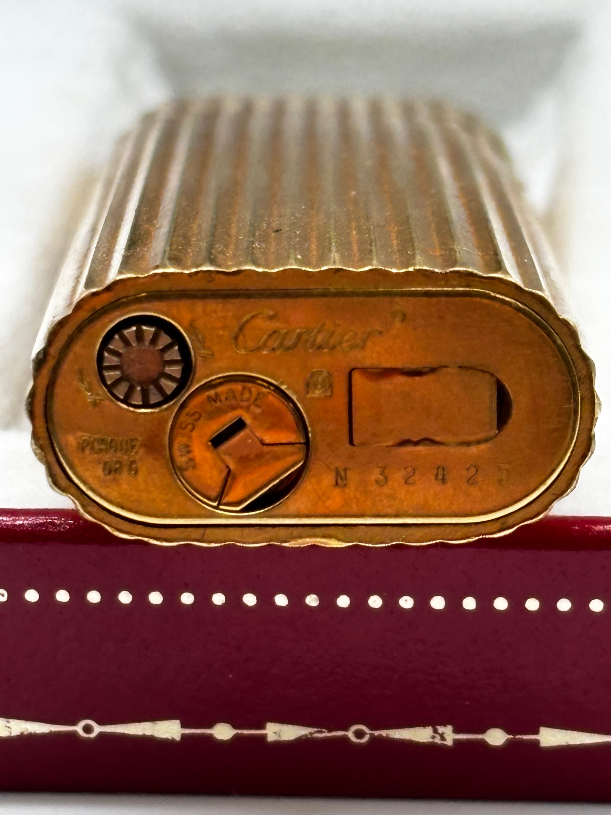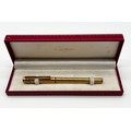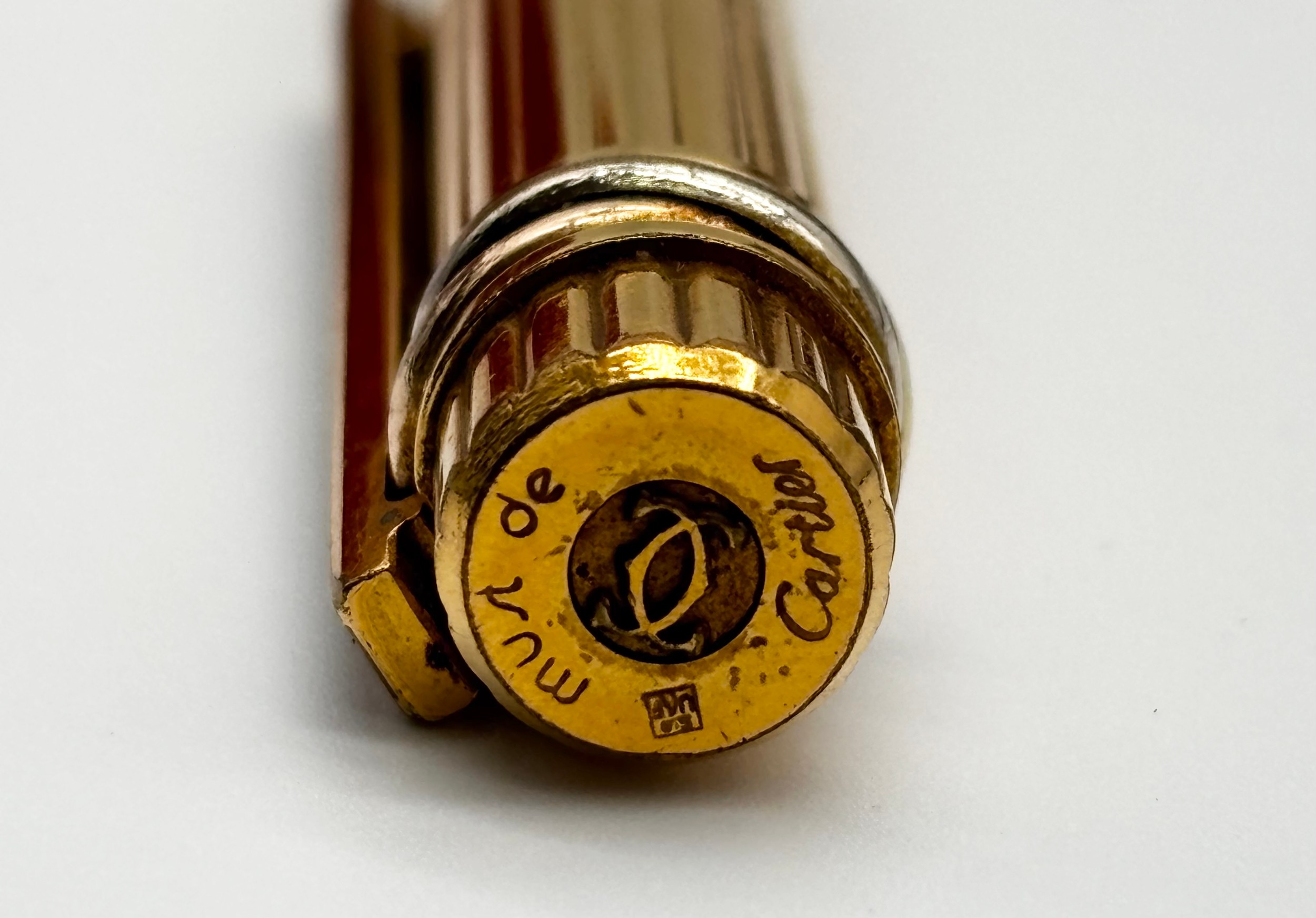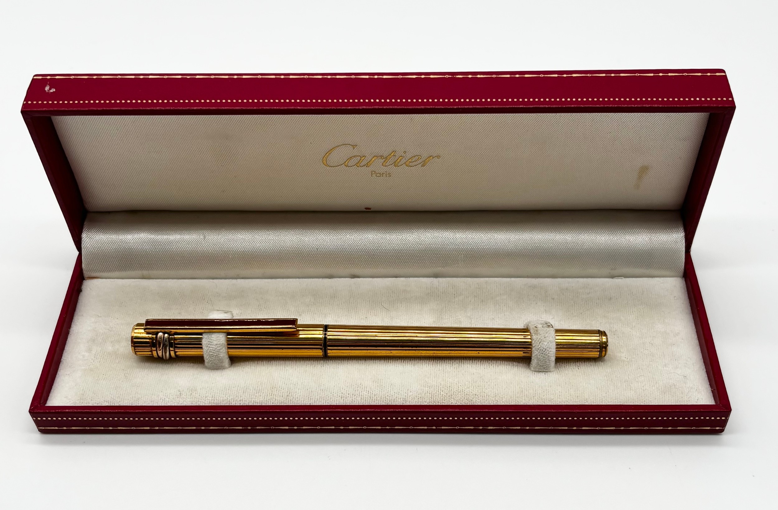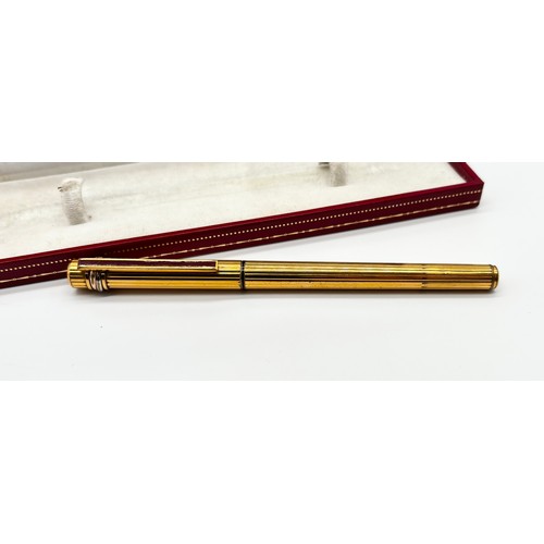 Gold plated Must De Cartier lighter in original box, Cartier gold plated ballpoint pen in original box and a Cartier lighter box