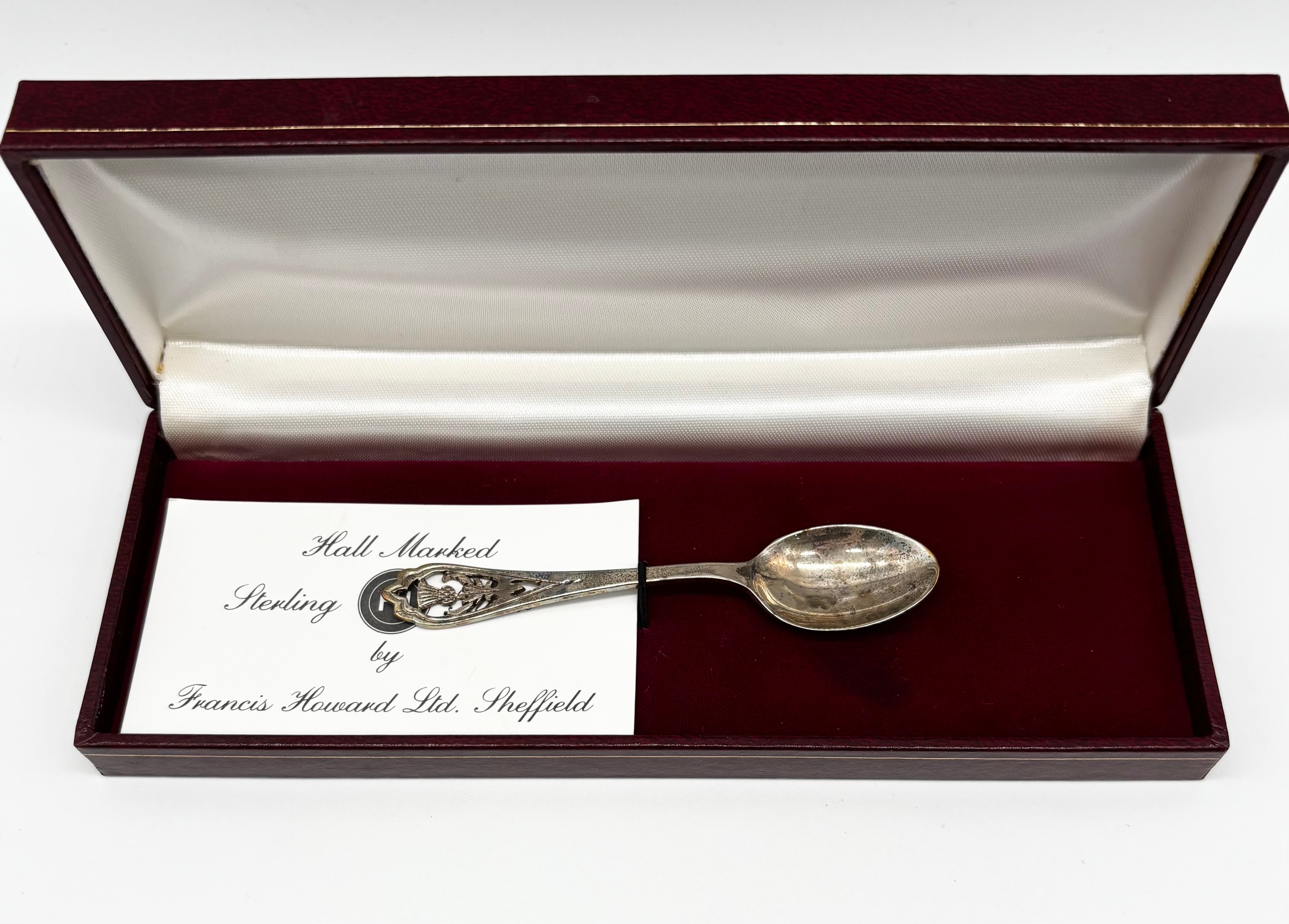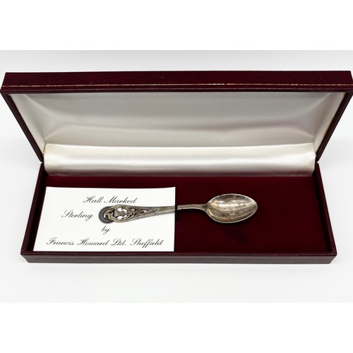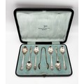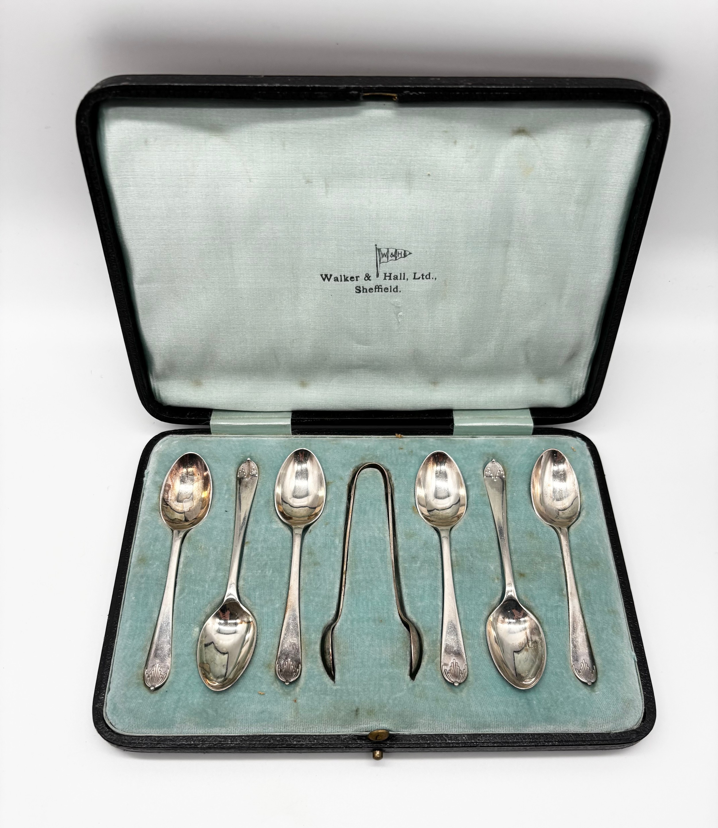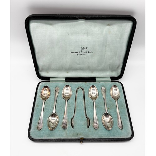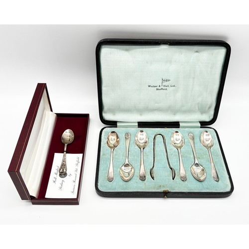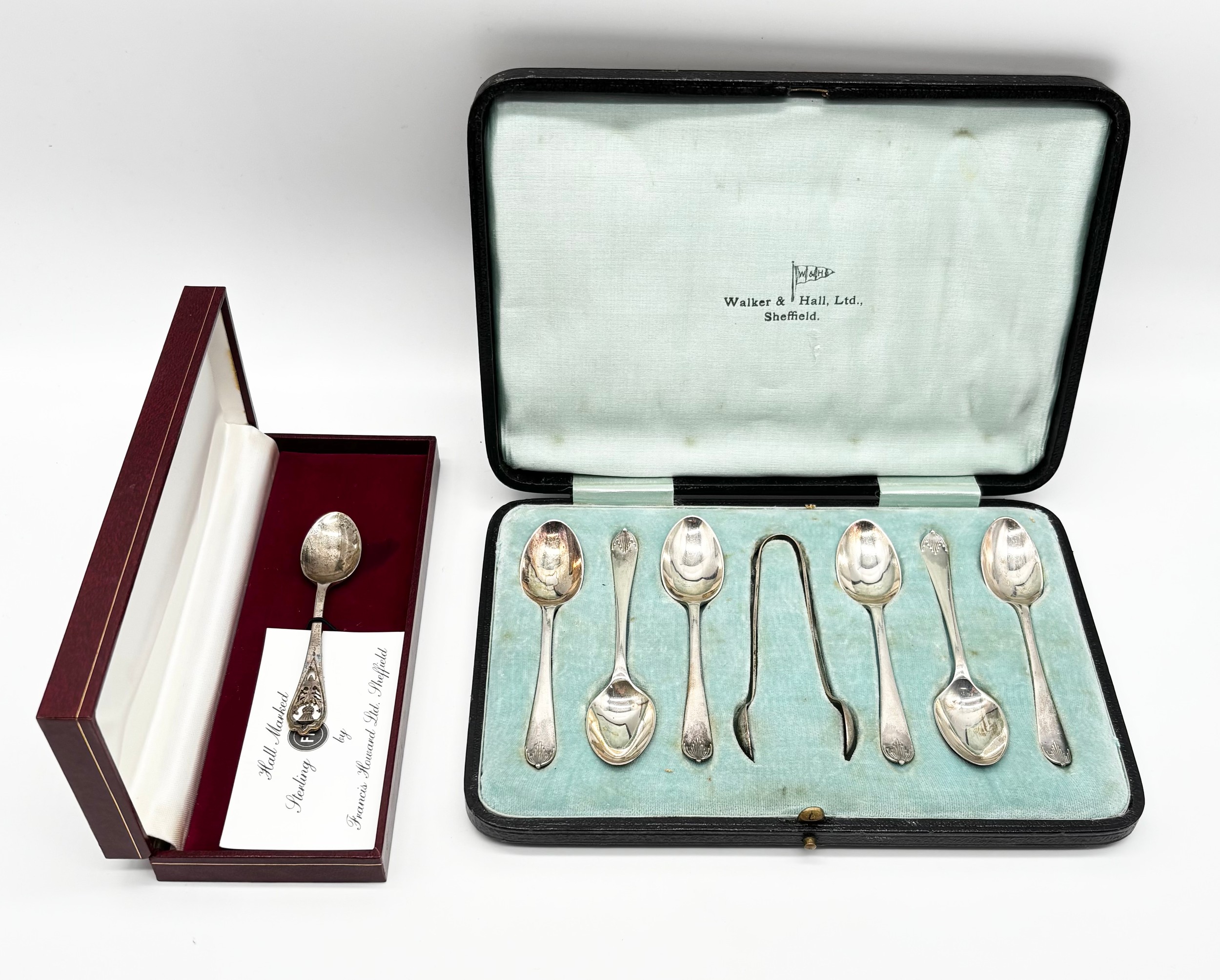 Cased set of six silver spoons and a pair of sugar tongs by Walker & Hall Ltd, Sheffield and a boxed silver tea spoon by Francis Howard Ltd, Sheffield