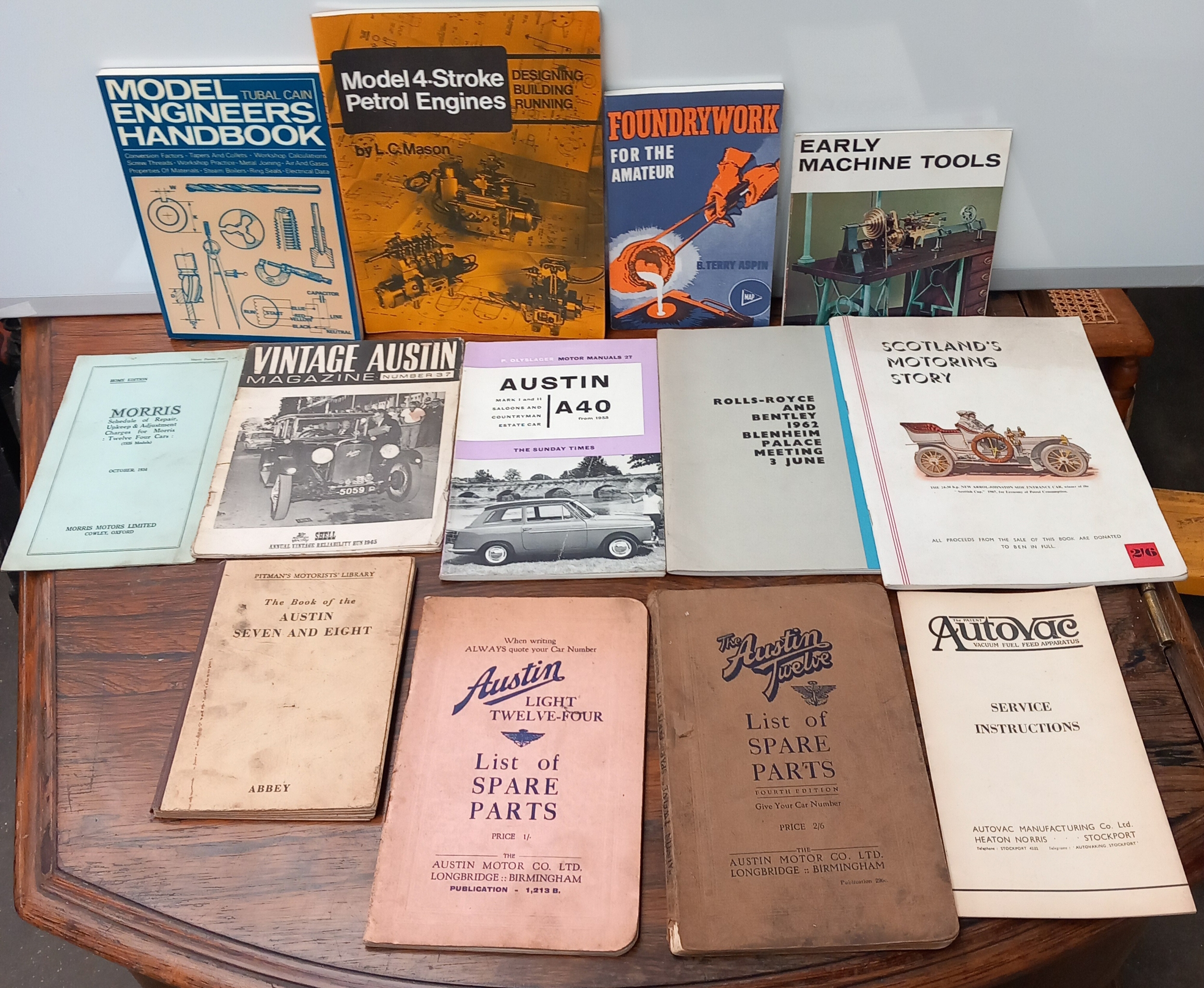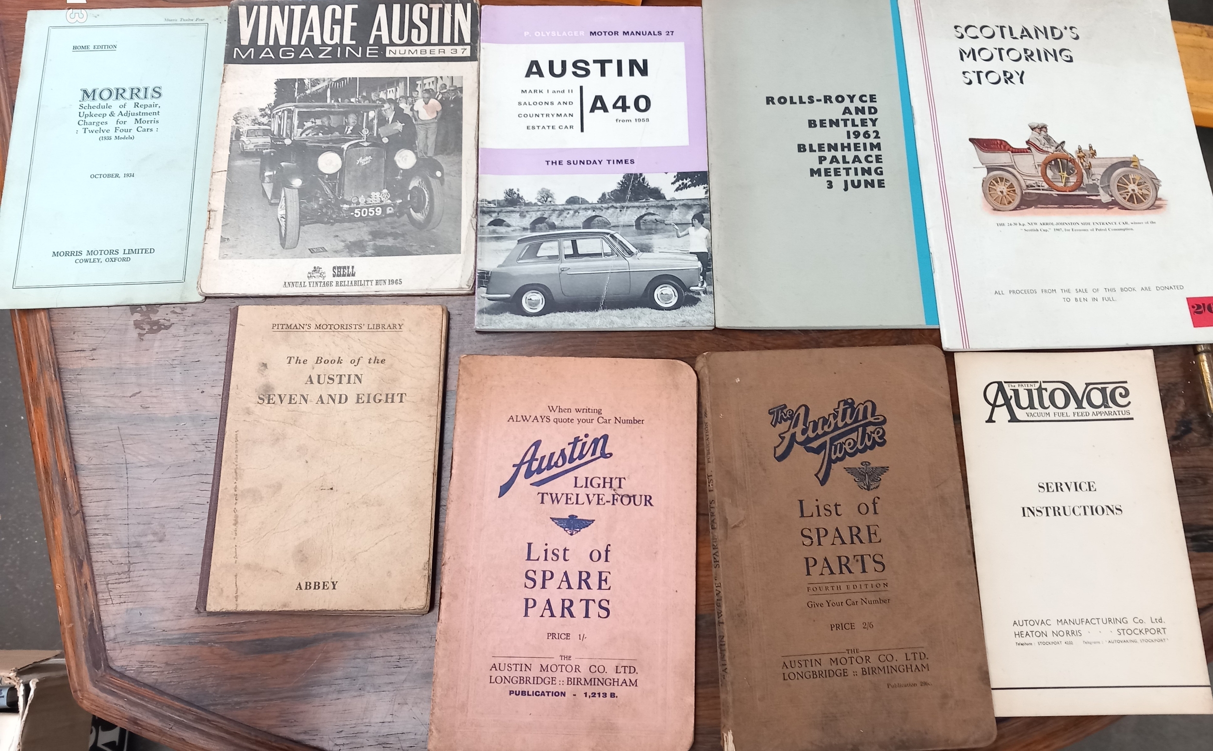 Vintage car manuals and refrence books to include: Austin A40, Rolls Royce, Morris and Austin 12.