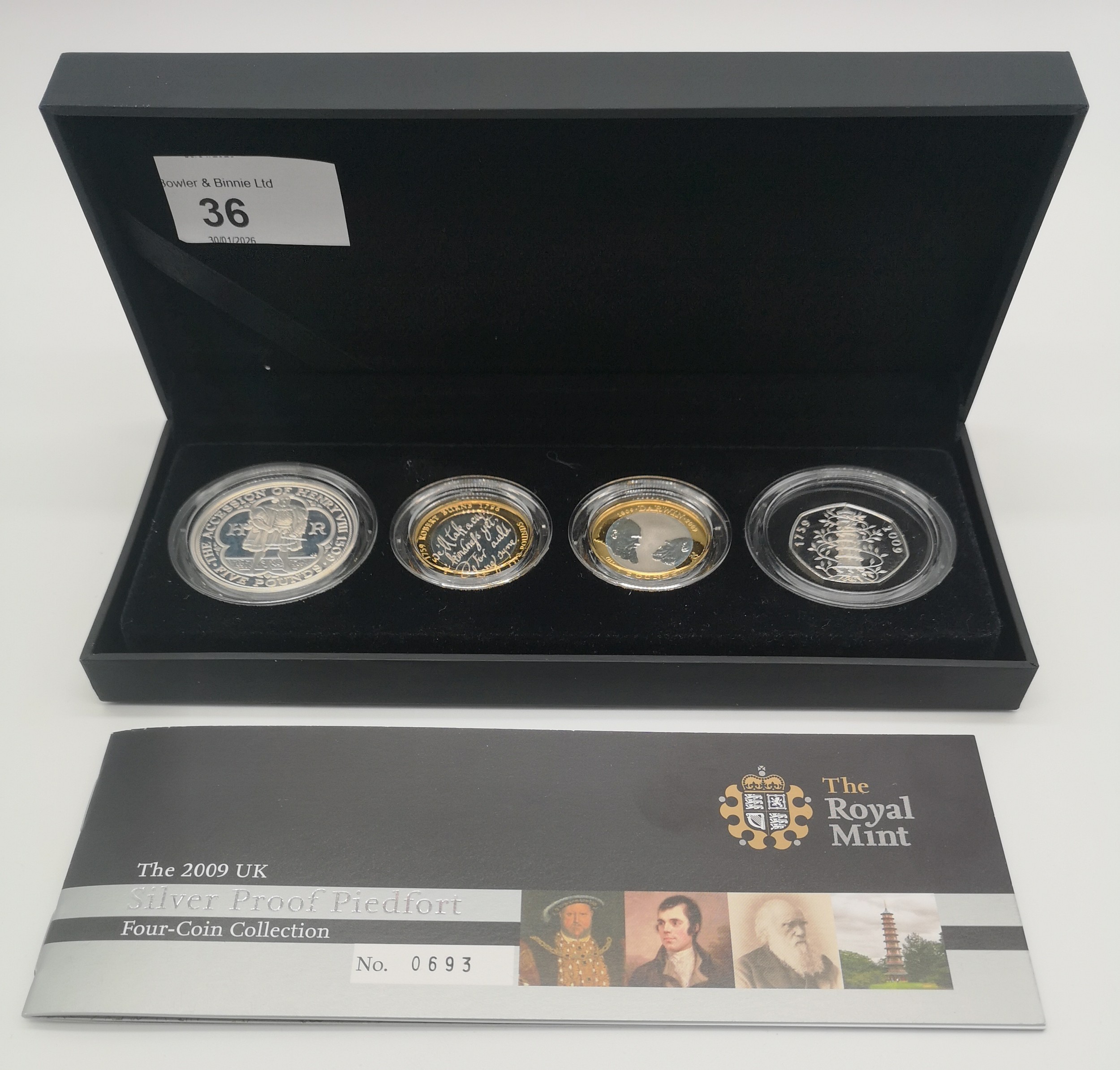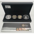 Set of Boxed 925 Silver Coins to include Kew Gardens Silver 50p, Charles Darwin Silver and Gold Coin, Robert Burns and Henry V111 silver 5 pound coin, combined weight: 120g