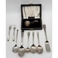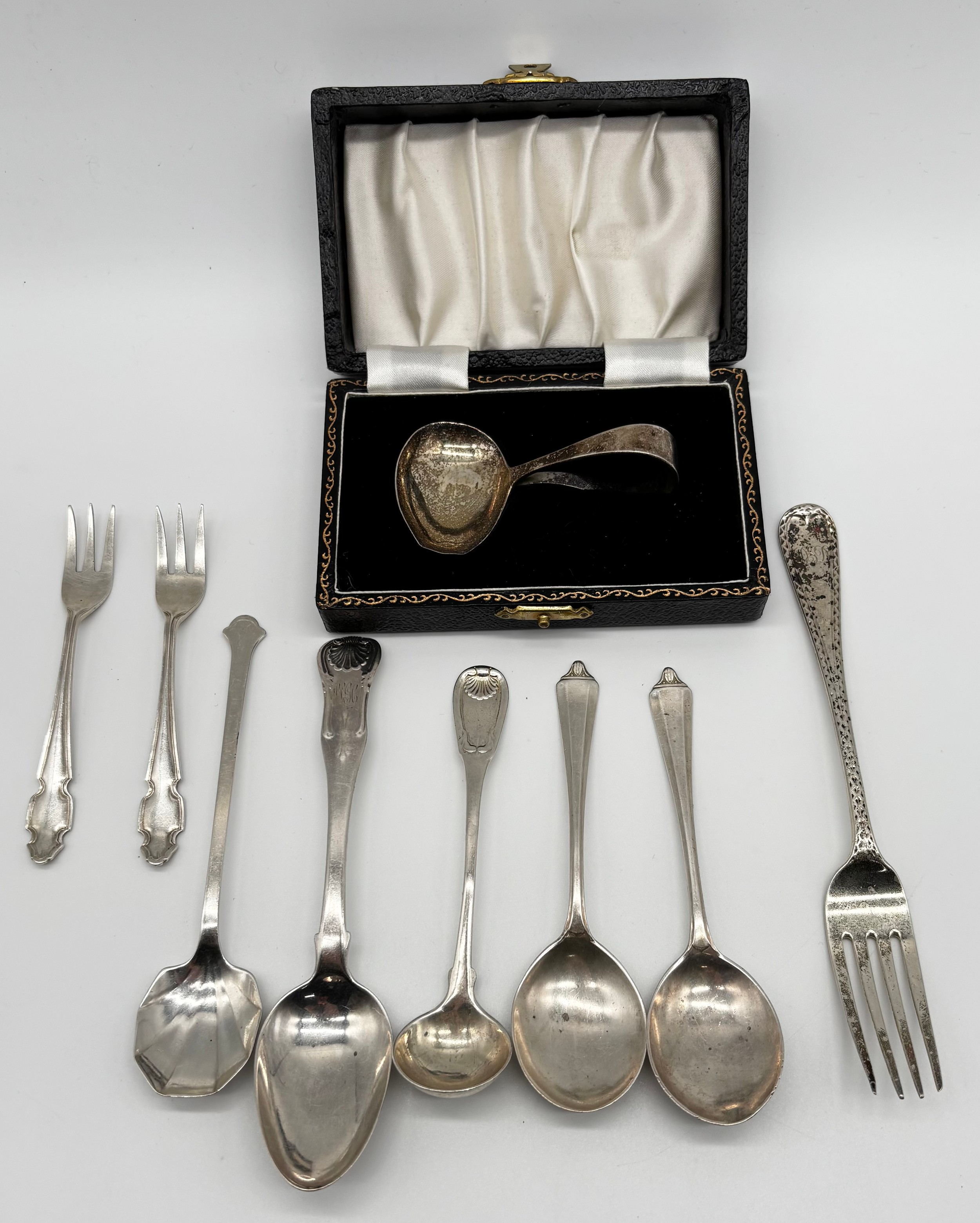 Silver Spoons and forks Nine in total, baby spoon in fitted original case, various makers and dates