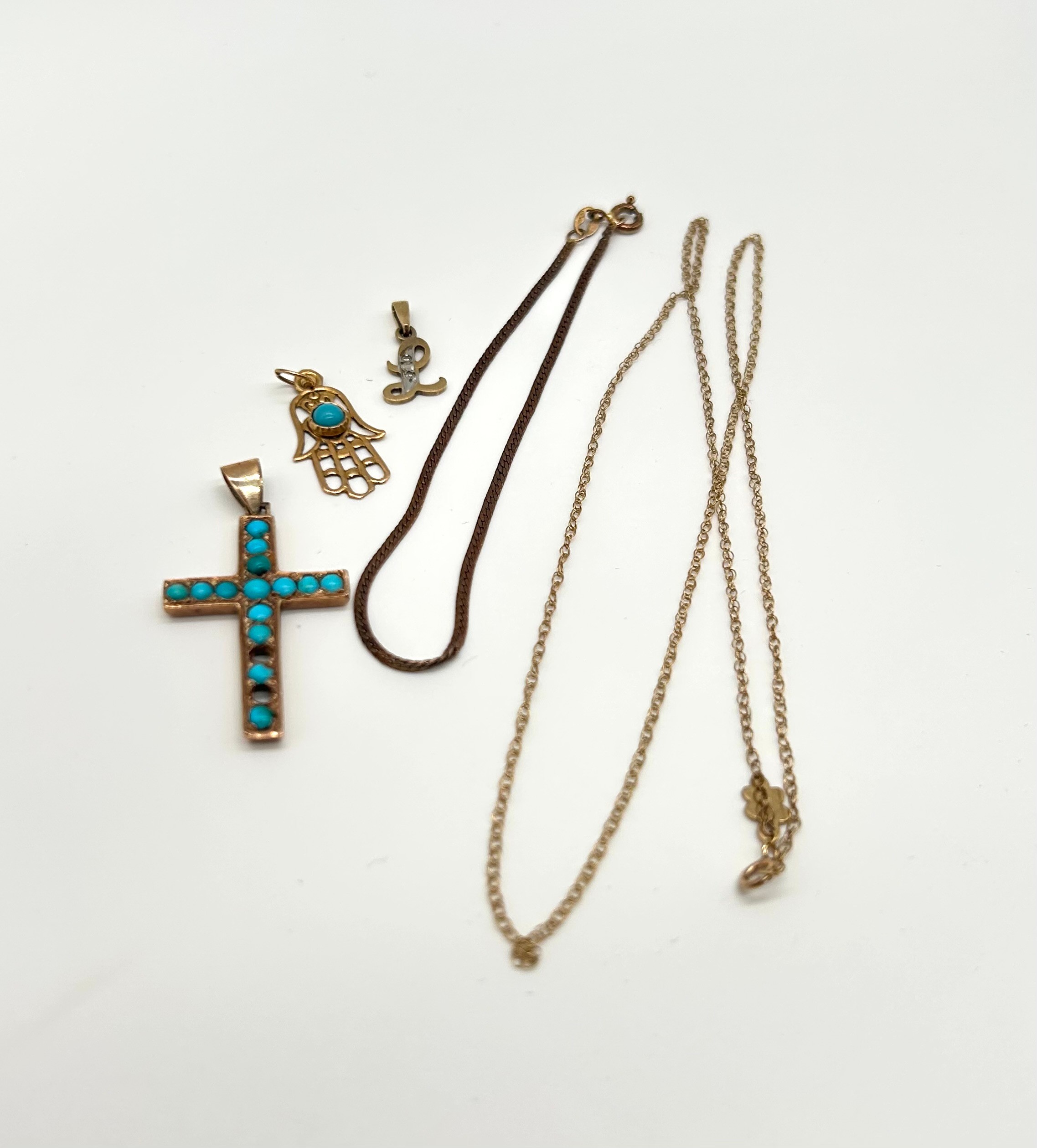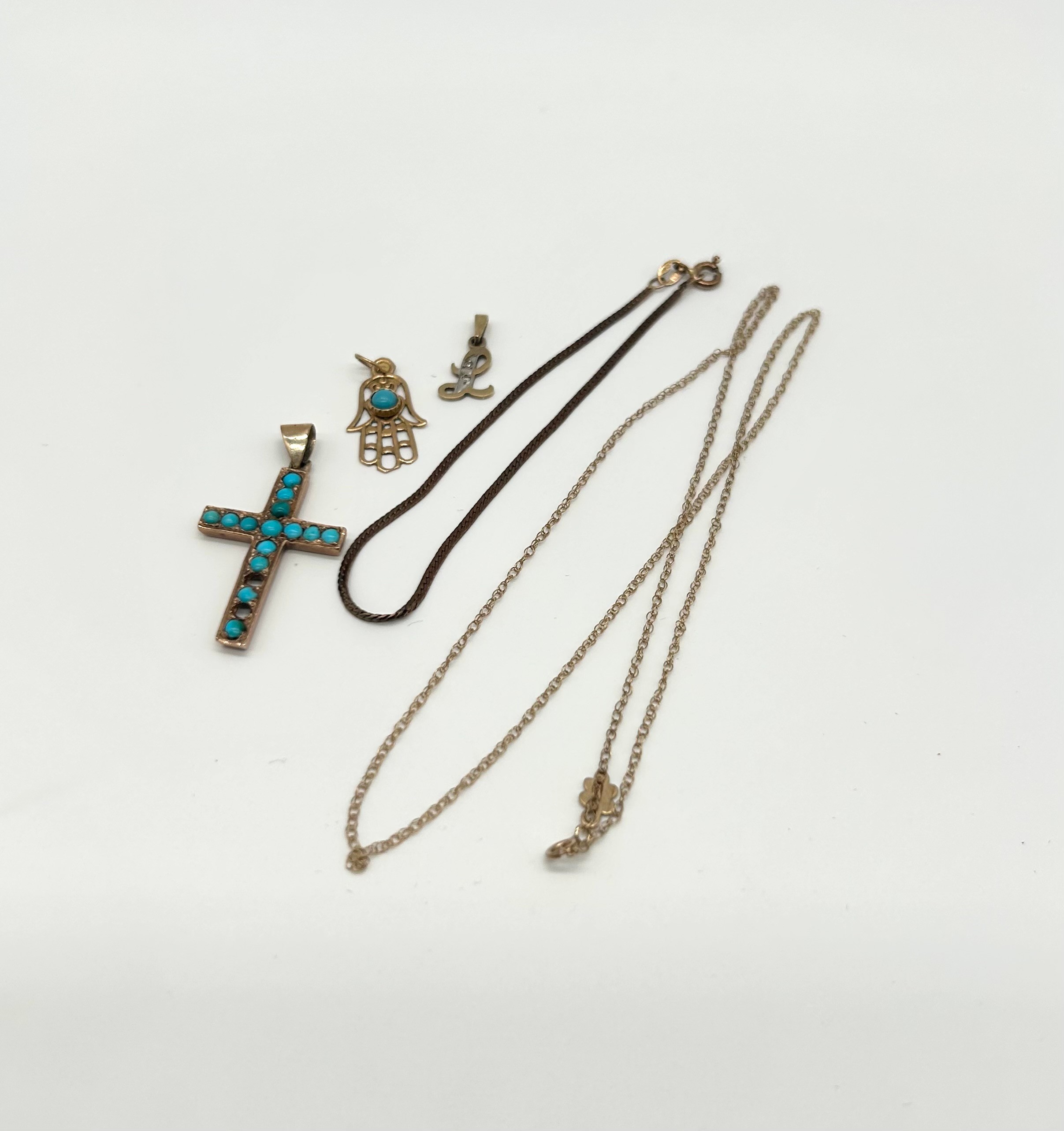 9ct Gold bracelet and necklace, 9ct Cross Pendant and 14ct Hamsa Pendant with Turquoise stone