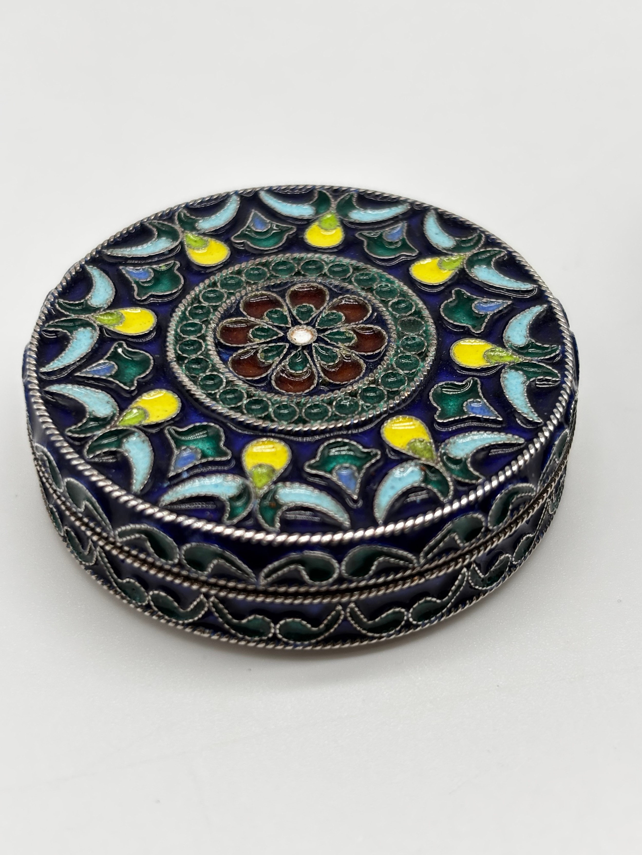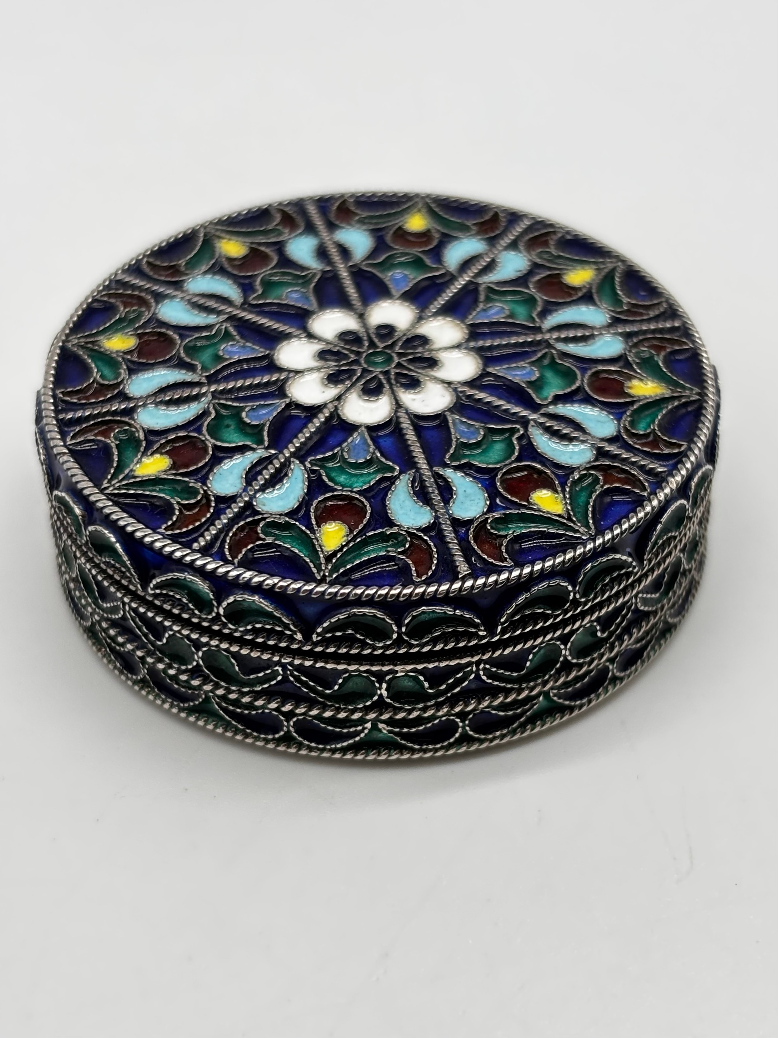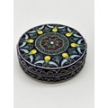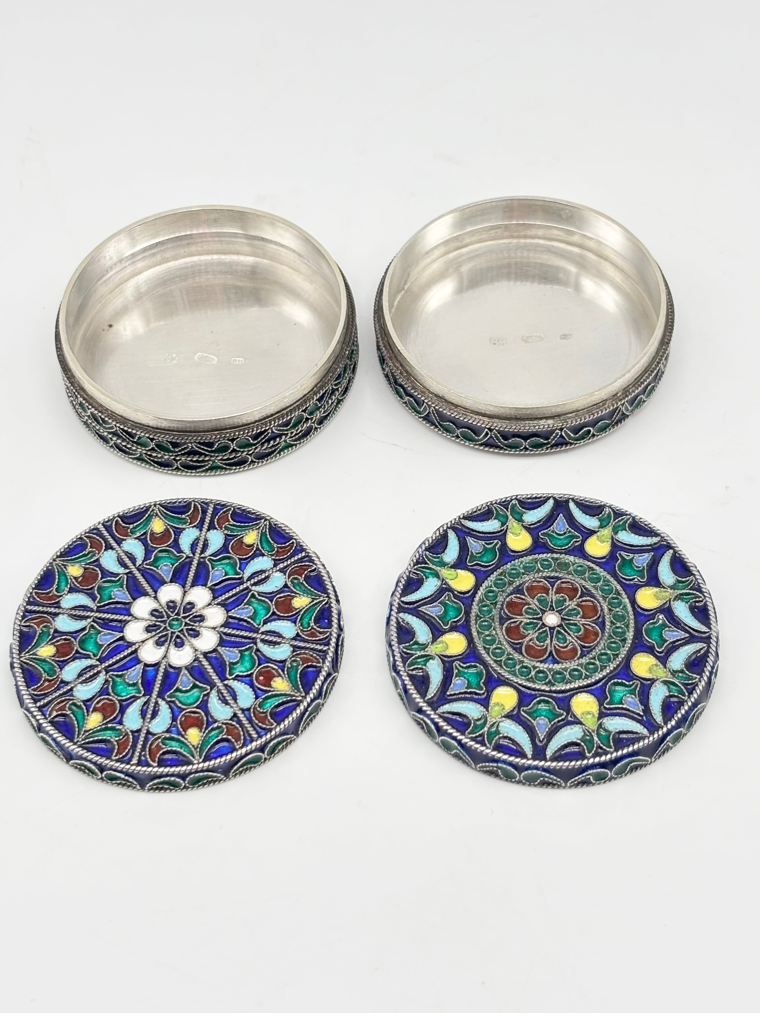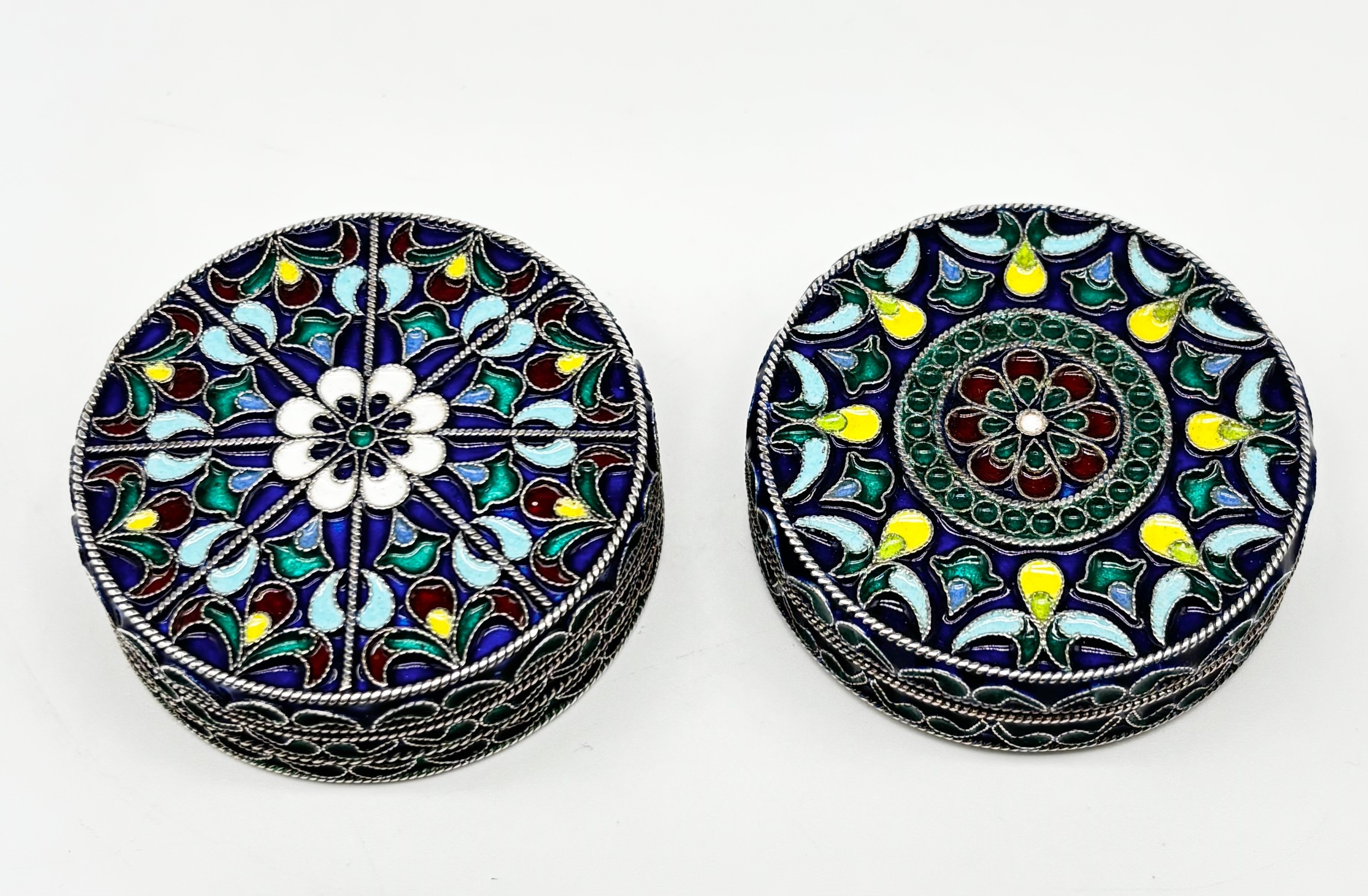 Two 800 grade Silver Lidded Trinket Dishes, with enamelled Flower and Fruit Design to tops and Sides, combined weight, 105.91g